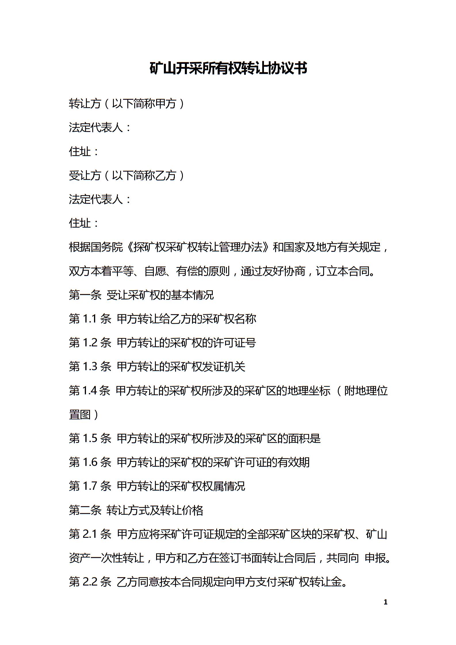 矿山开采所有权转让协议书