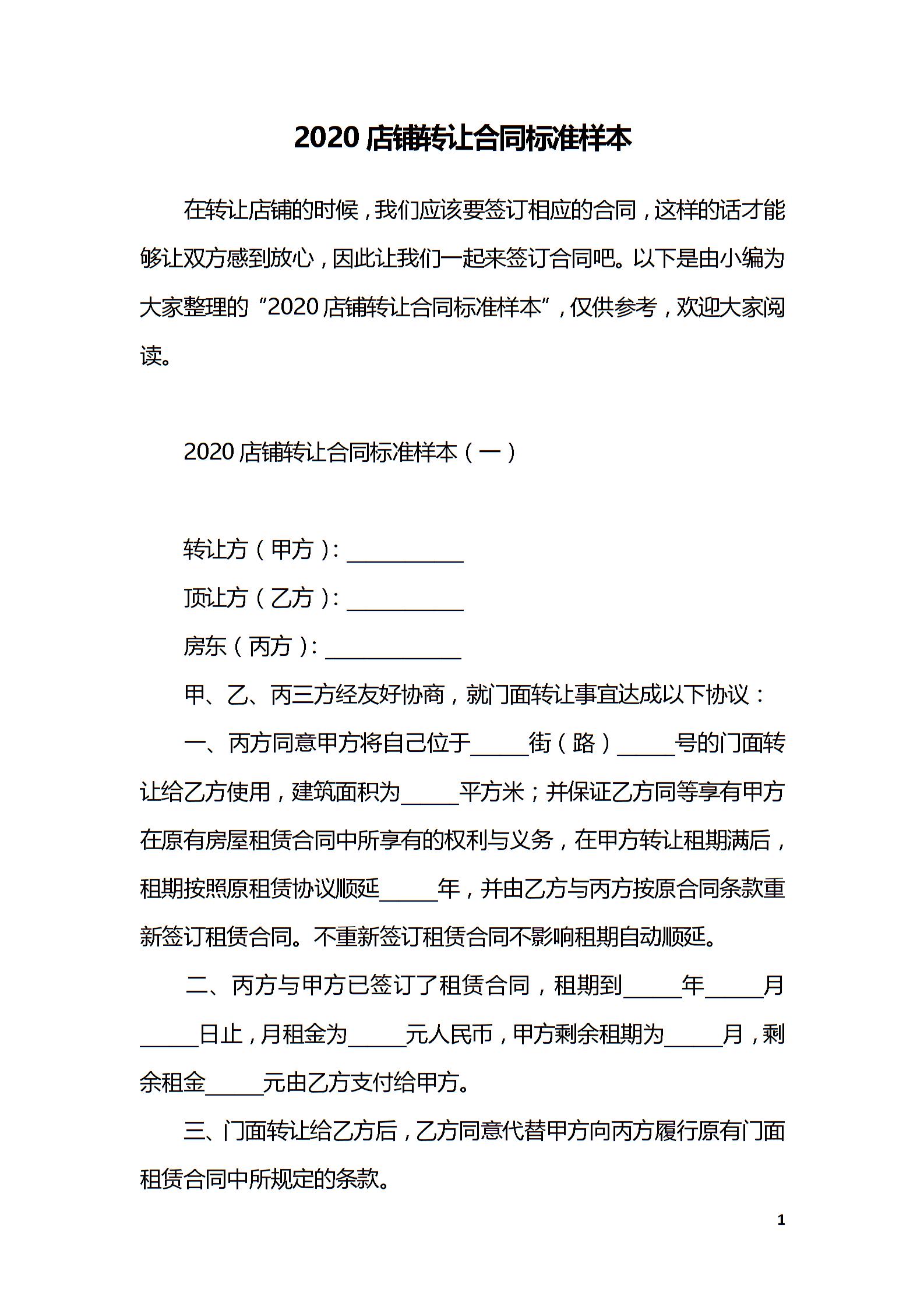 2020店铺转让合同标准样本