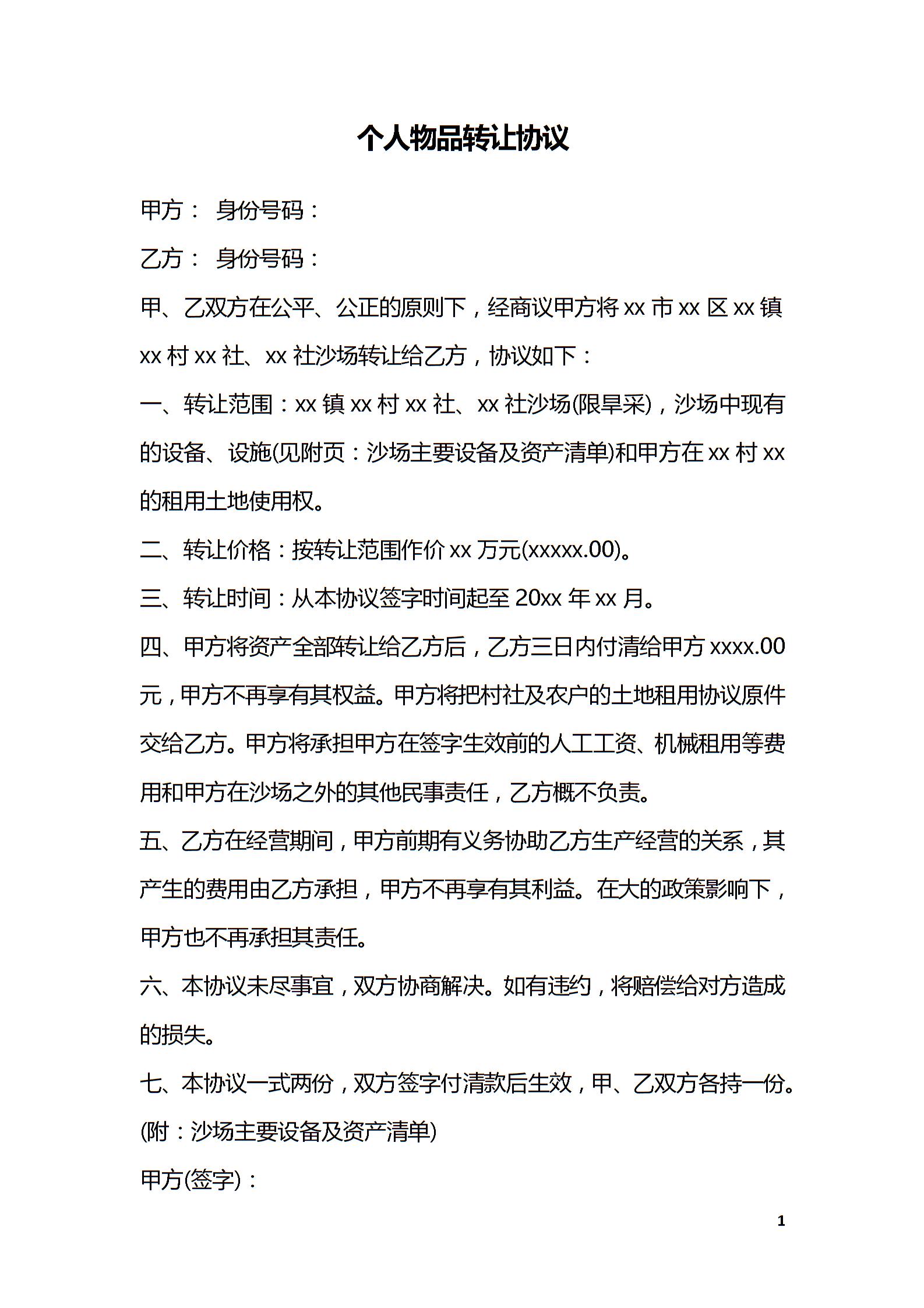 个人物品转让协议