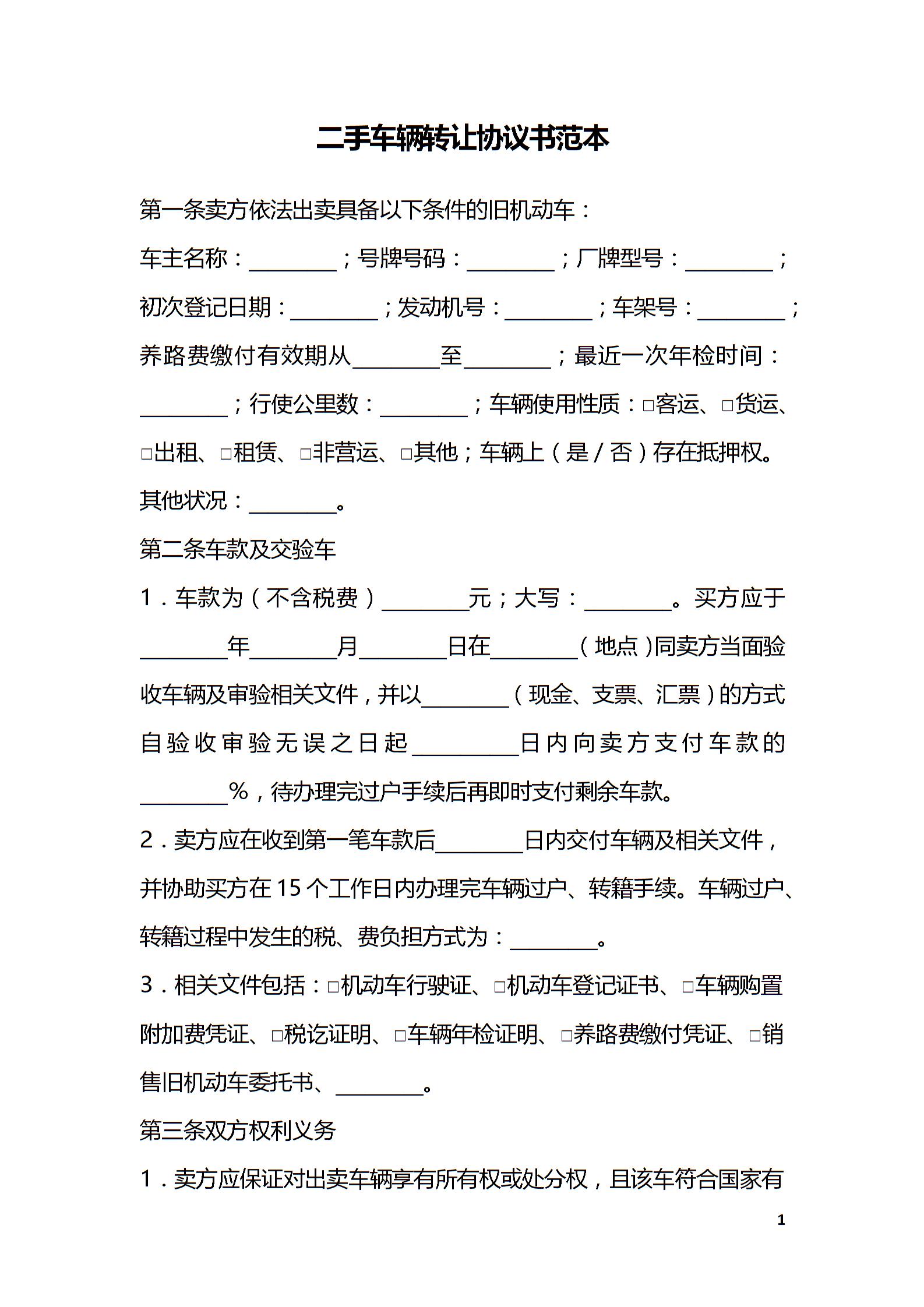 二手车辆转让协议书范本