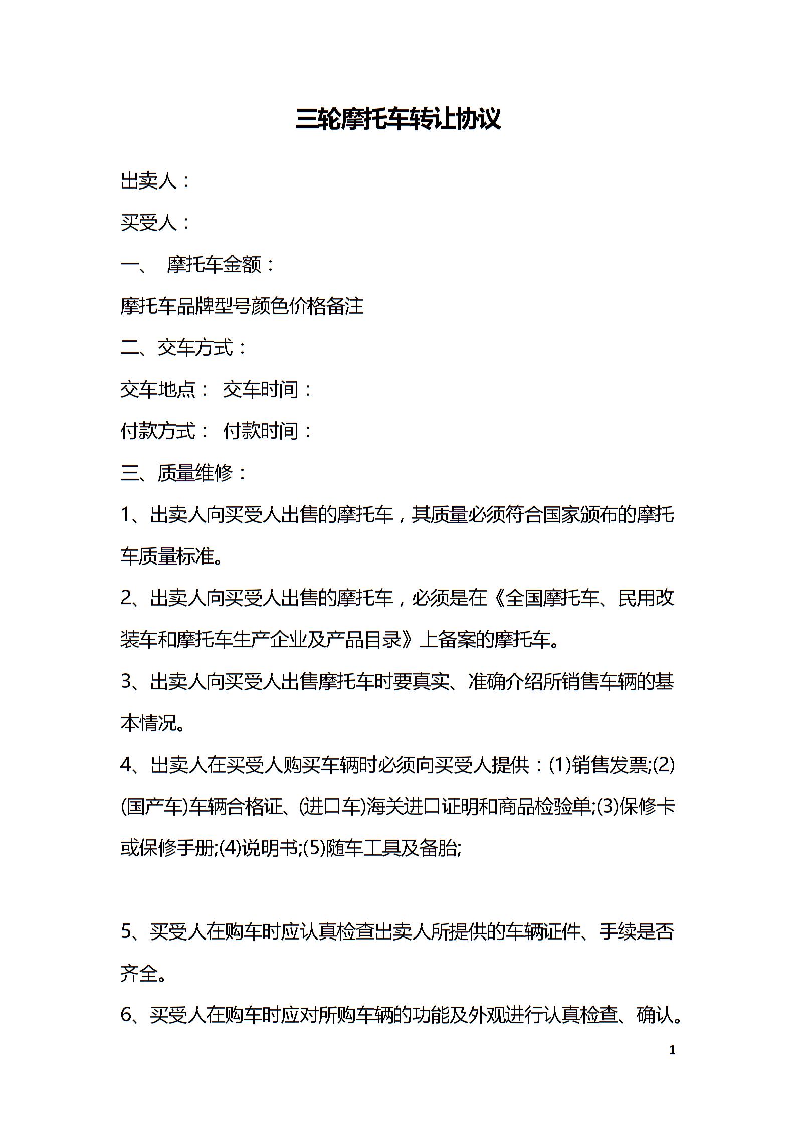 三轮摩托车转让协议