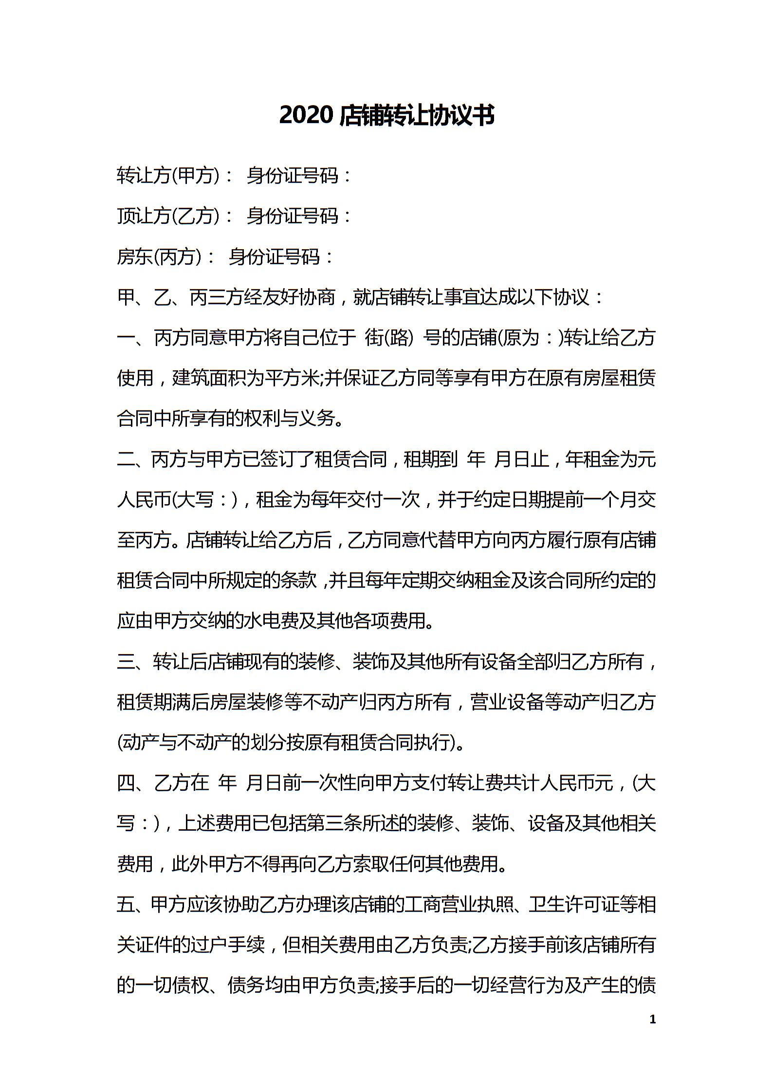 2020店铺转让协议书