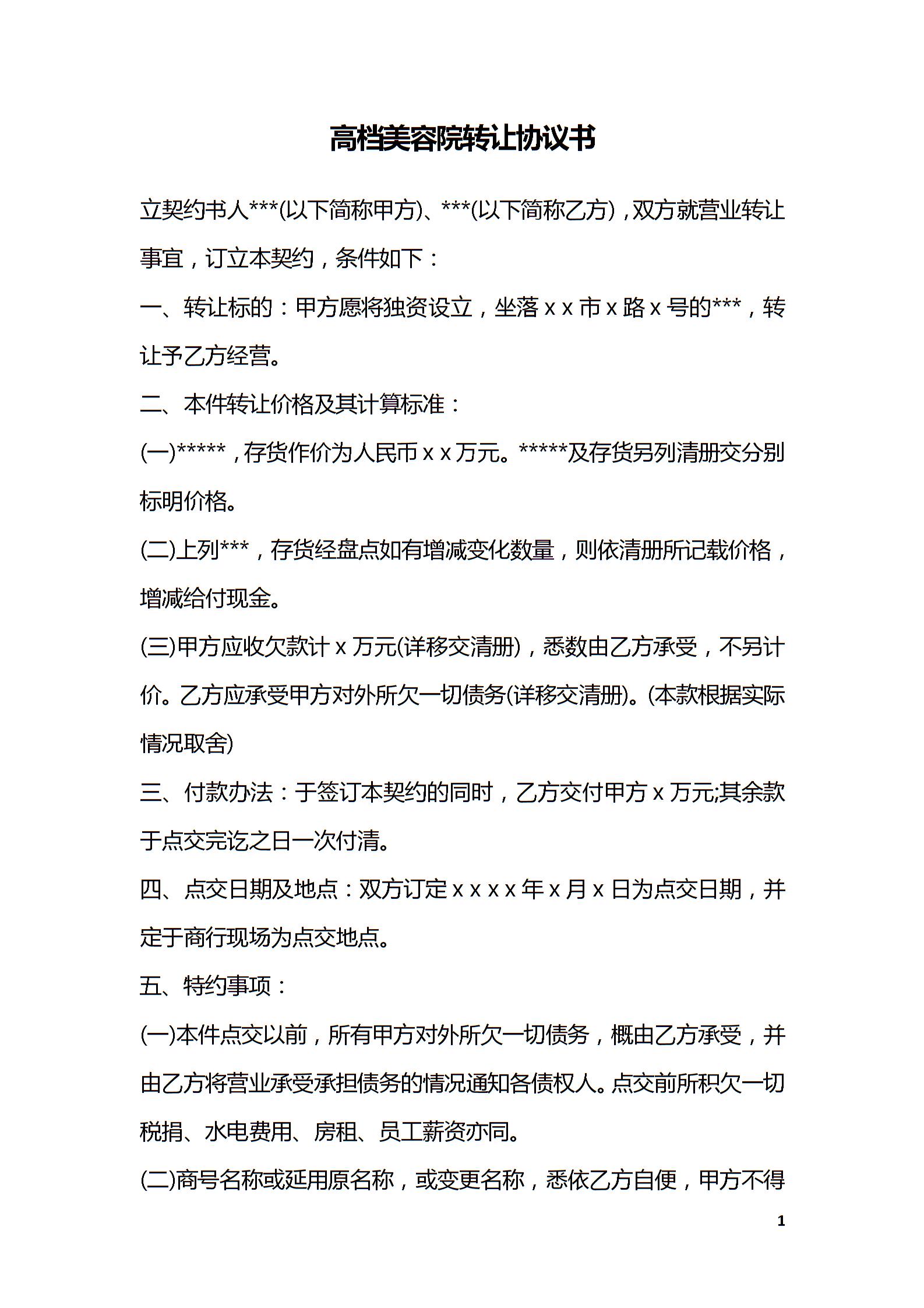 高档美容院转让协议书