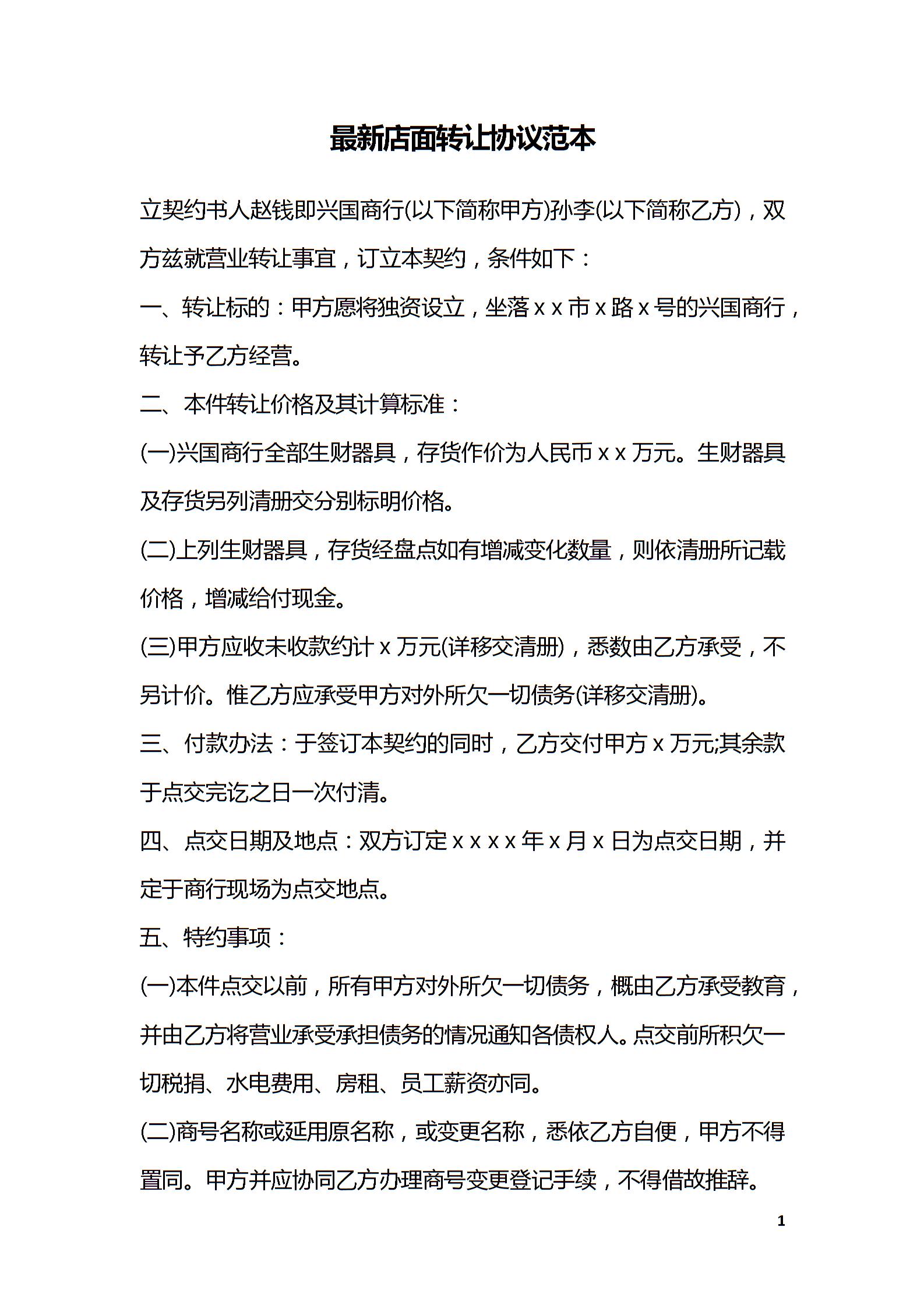 最新店面转让协议范本