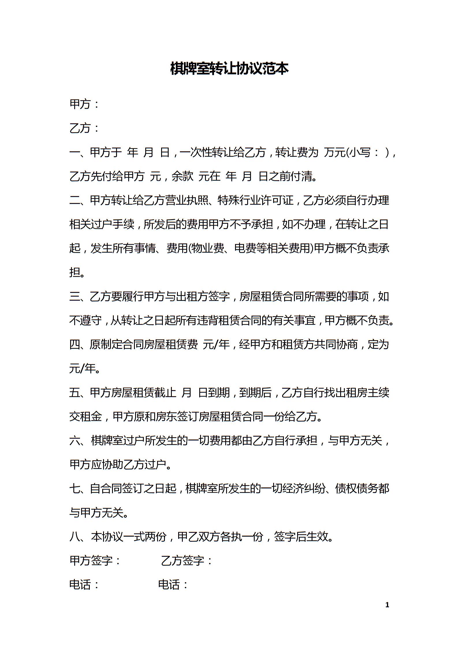 棋牌室转让协议范本