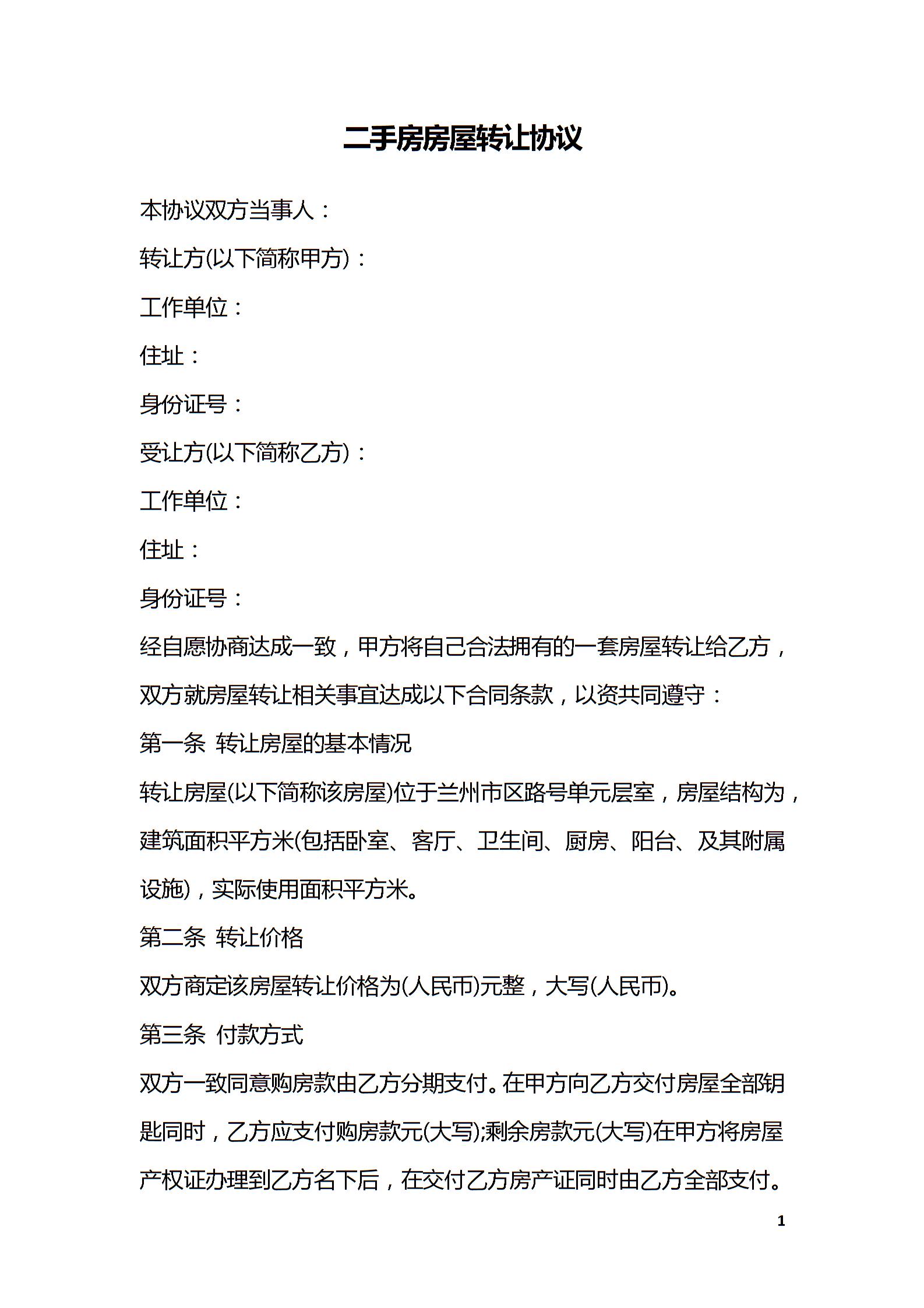 二手房房屋转让协议