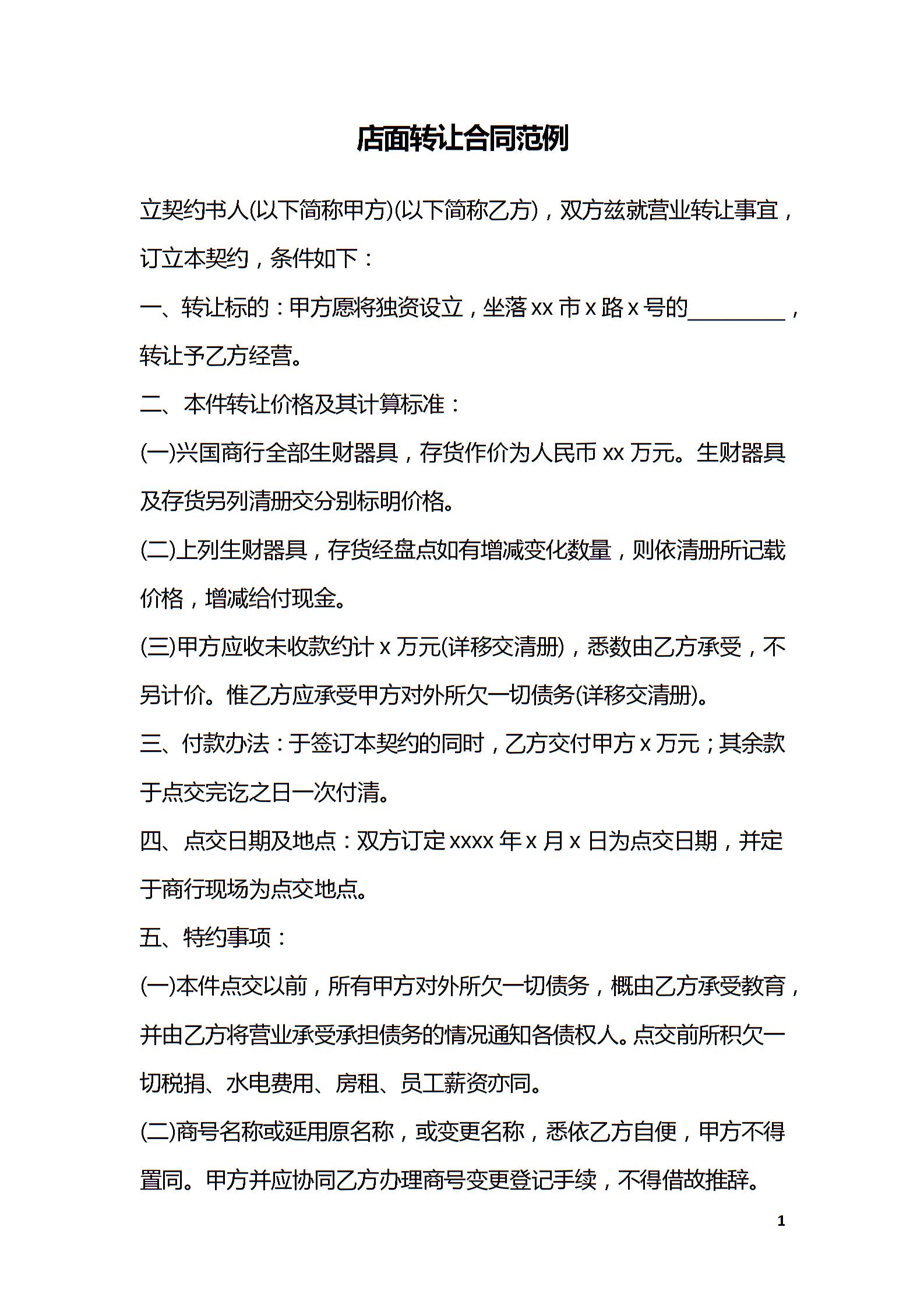 店面转让合同范例
