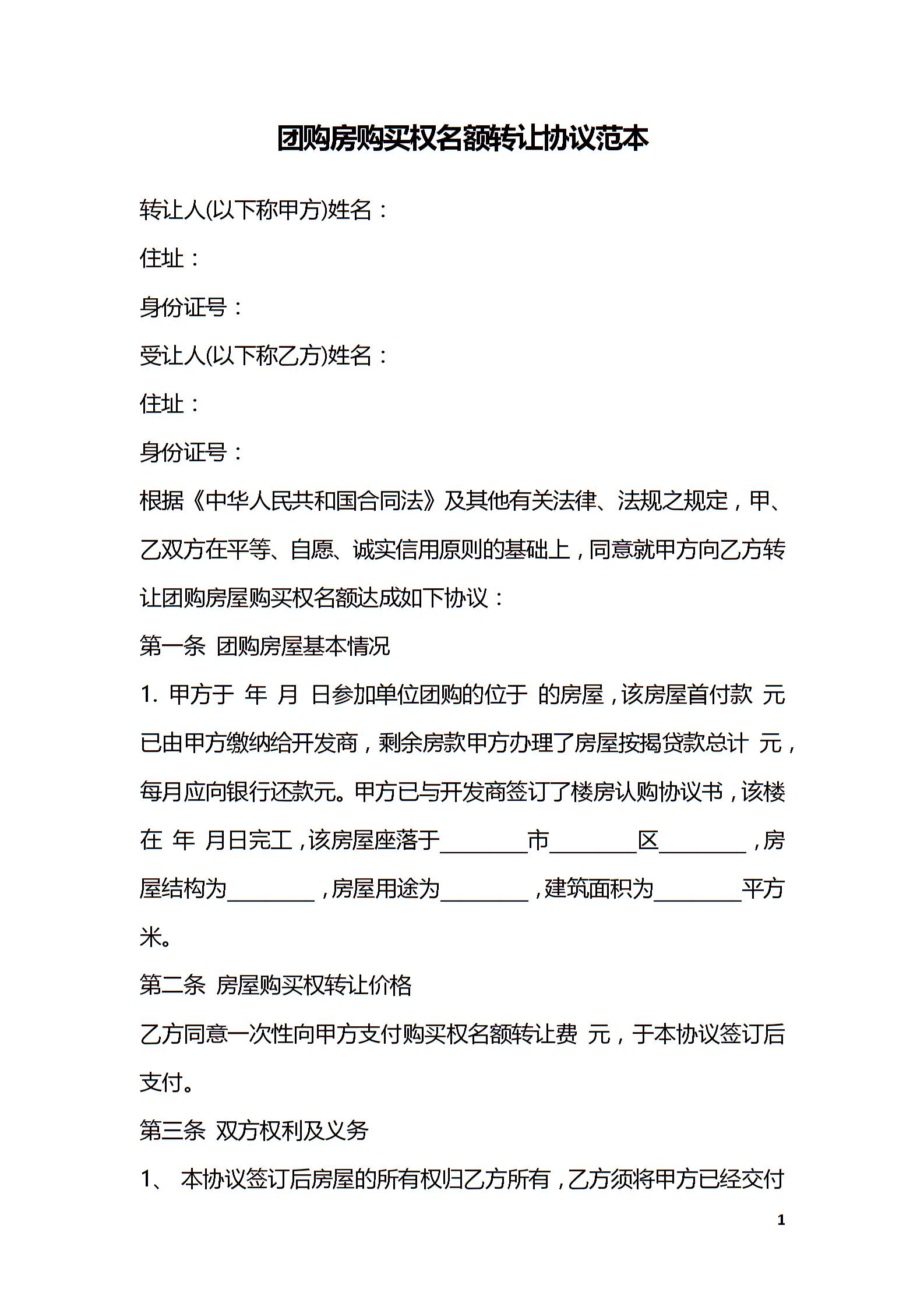 团购房购买权名额转让协议范本