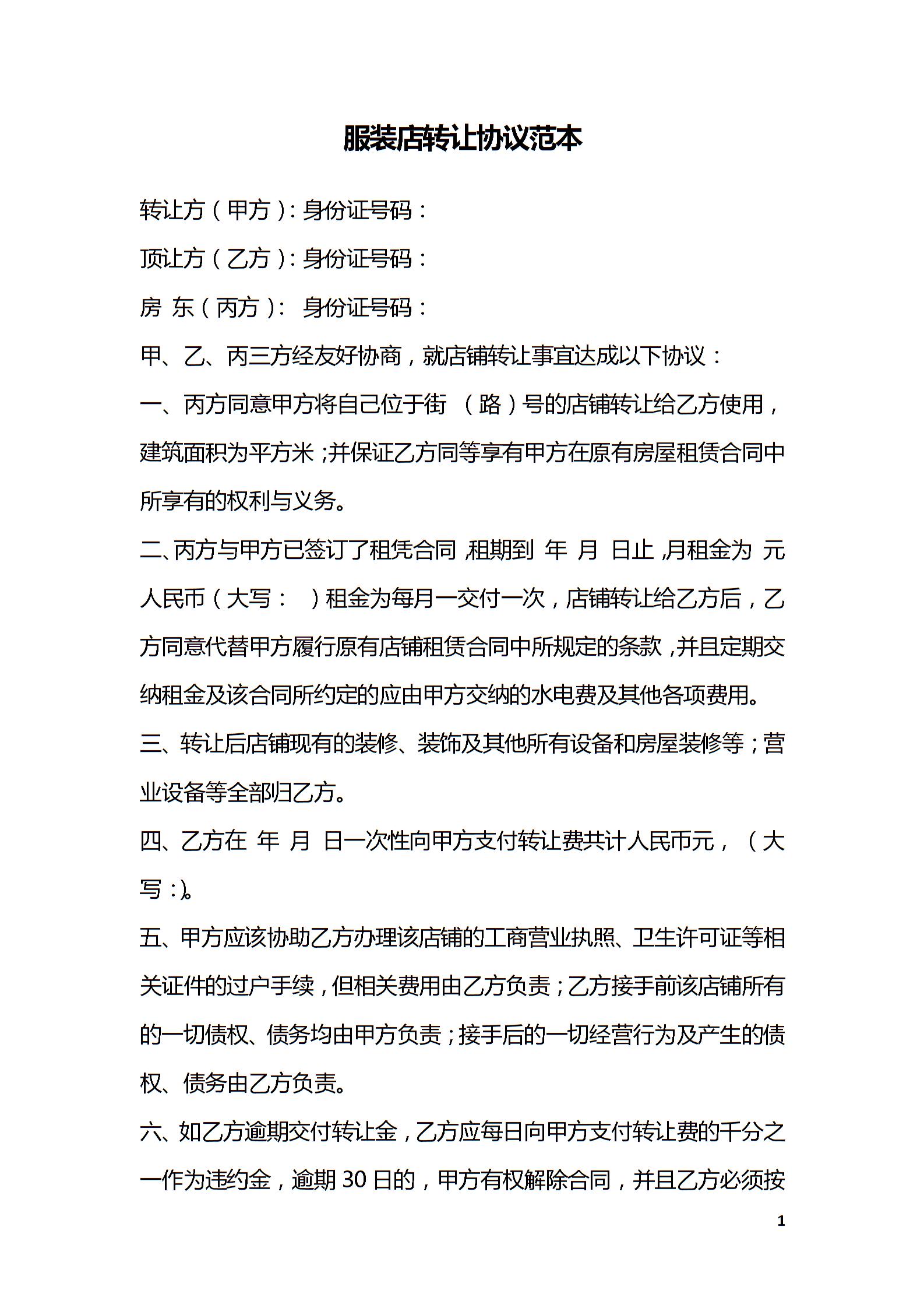 服装店转让协议范本