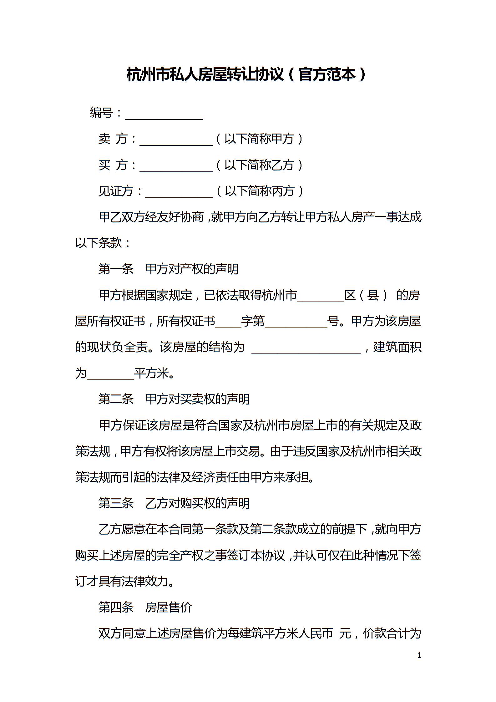 杭州市私人房屋转让协议(官方范本)
