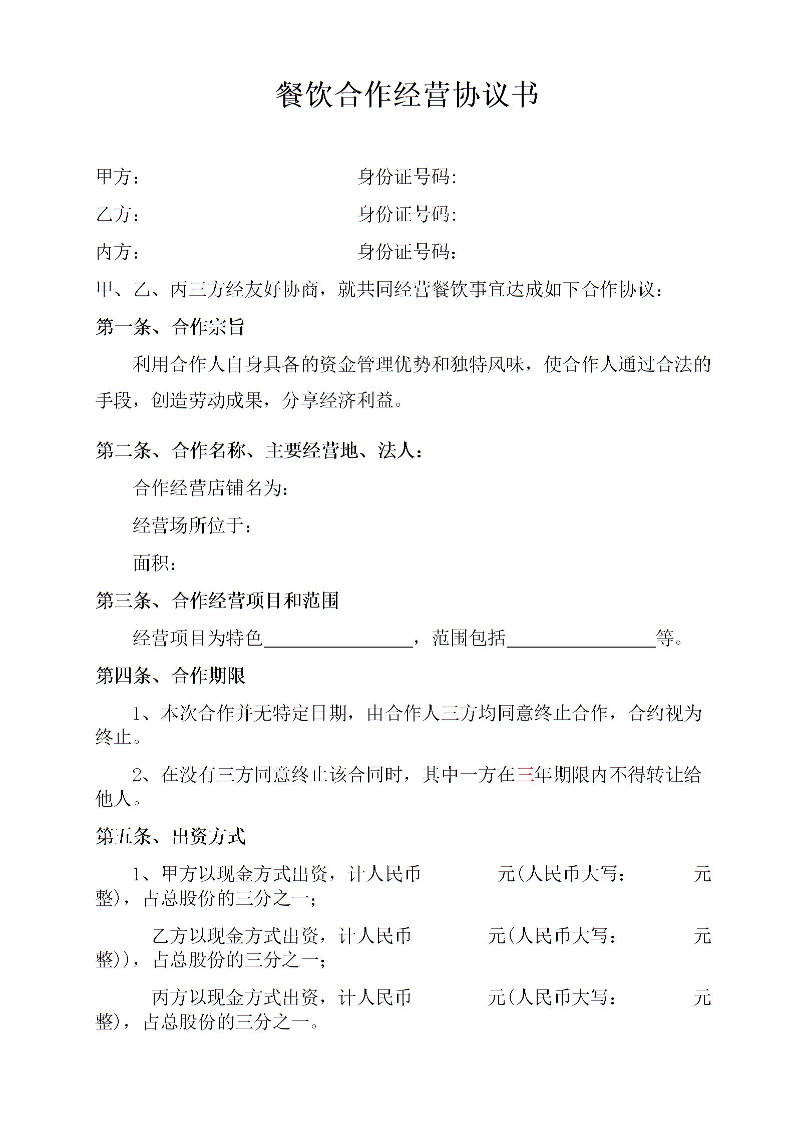 餐饮合作经营协议书