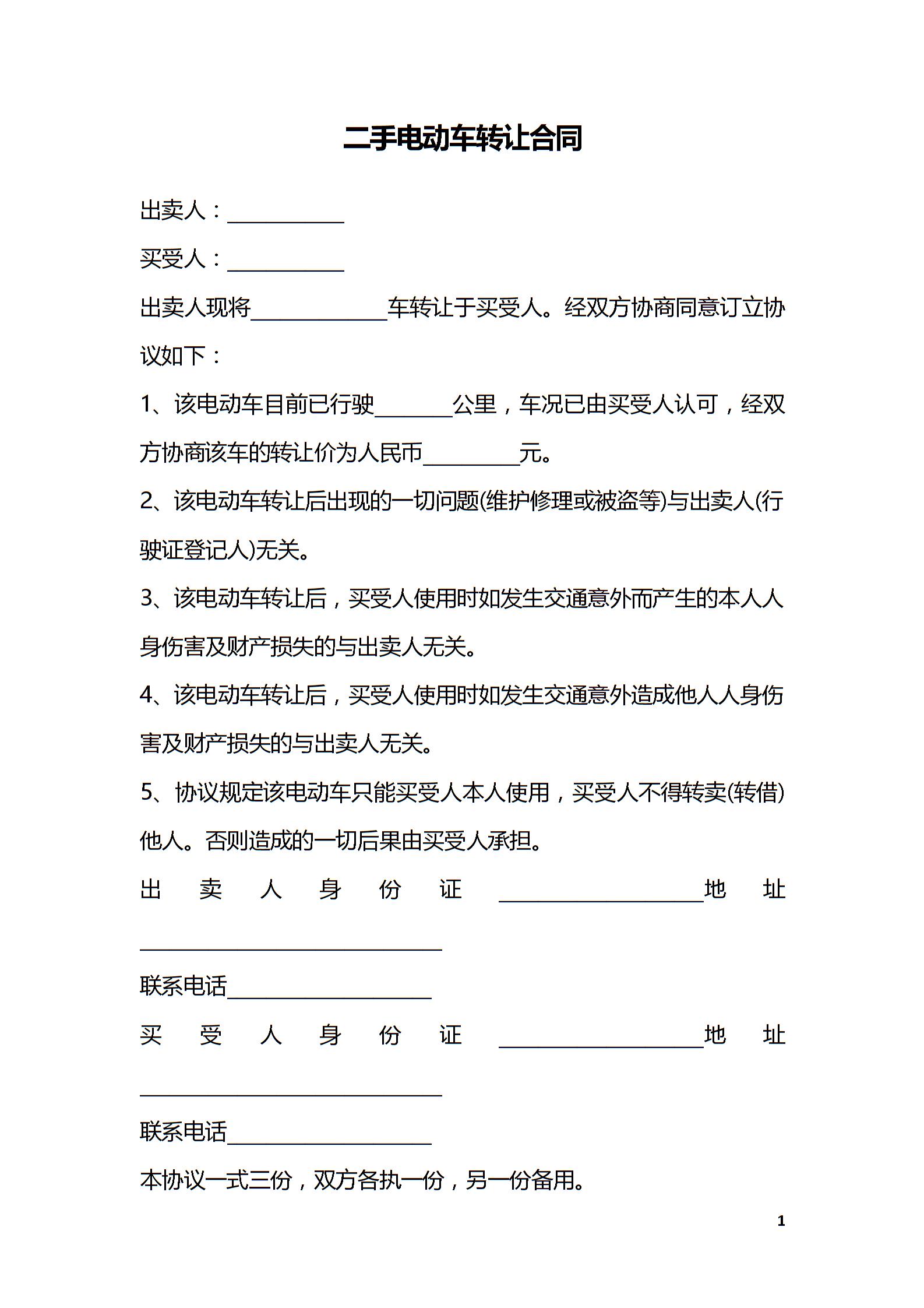 二手电动车转让合同