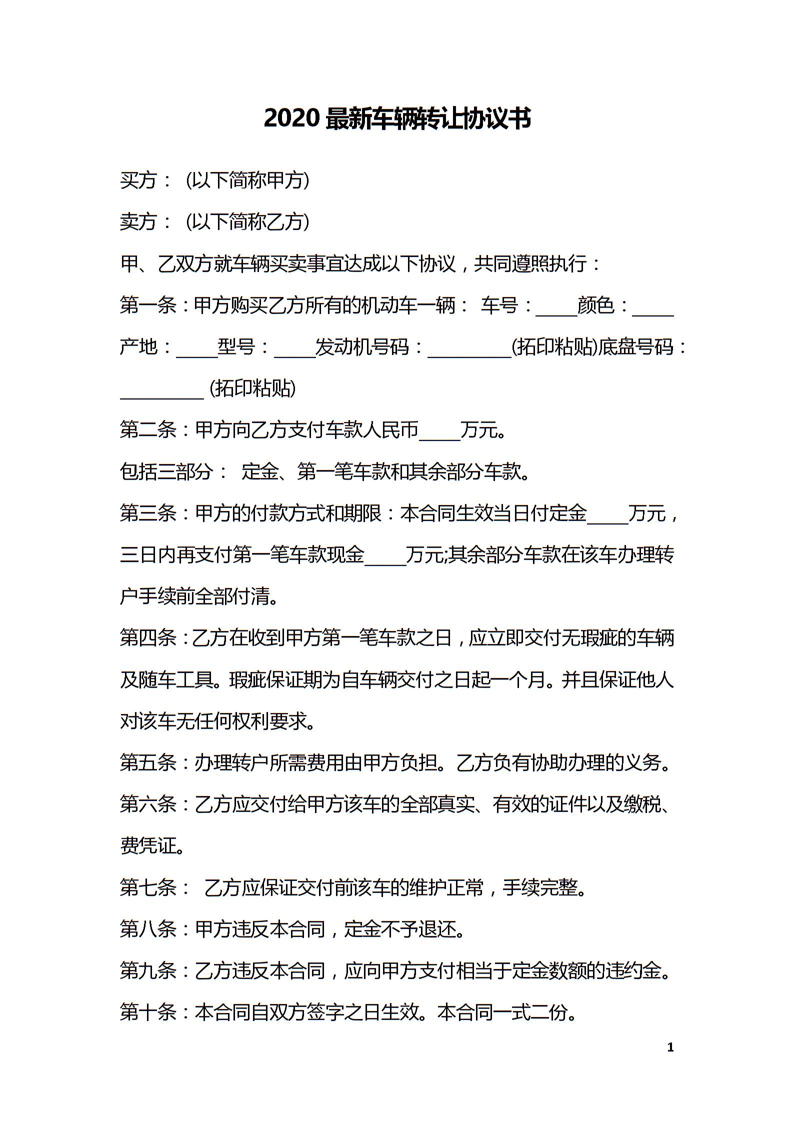 2020最新车辆转让协议书