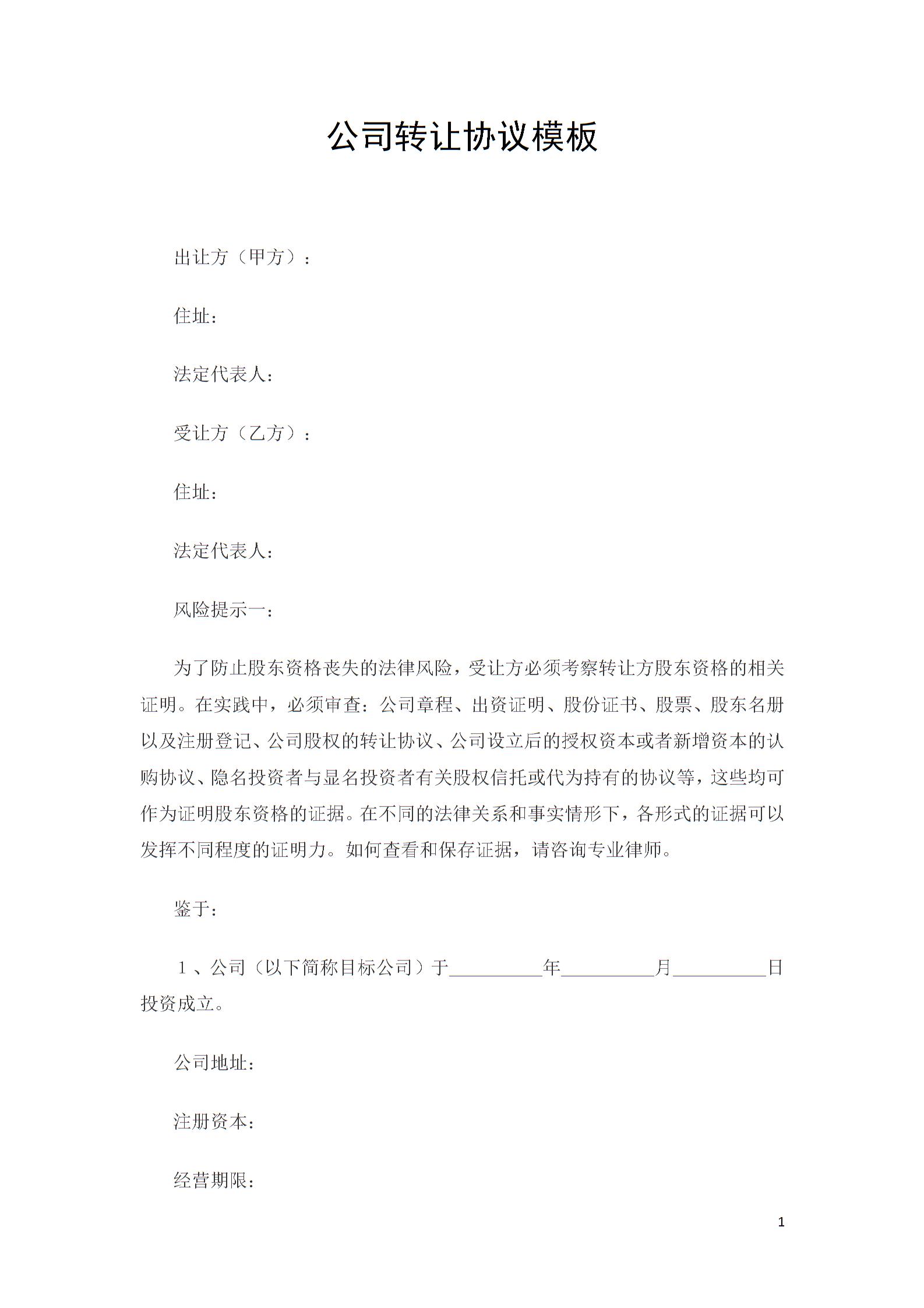公司转让协议模板(通用模板)