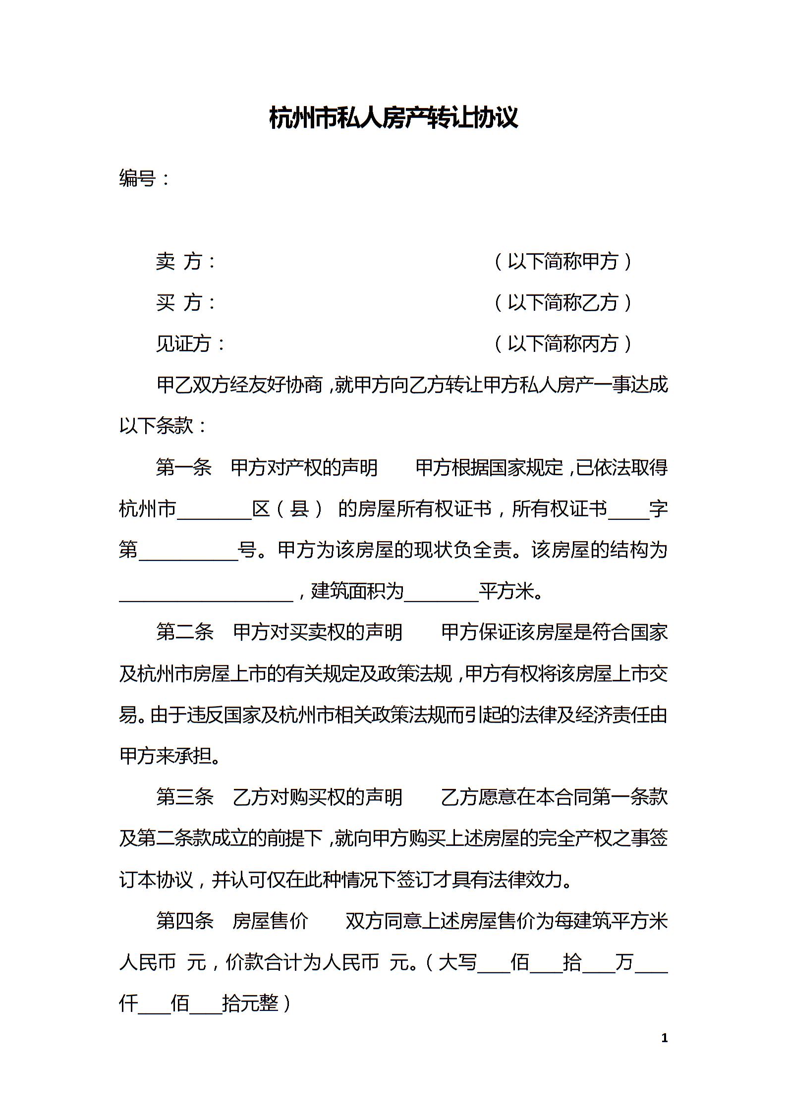 杭州市私人房产转让协议