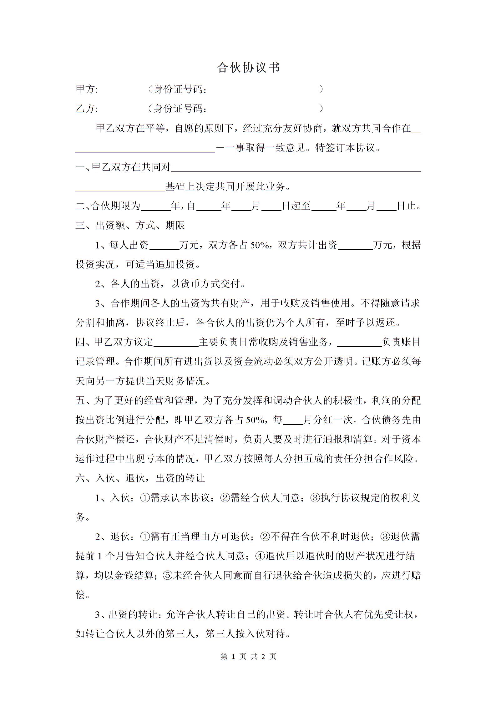 二人合伙经营协议书