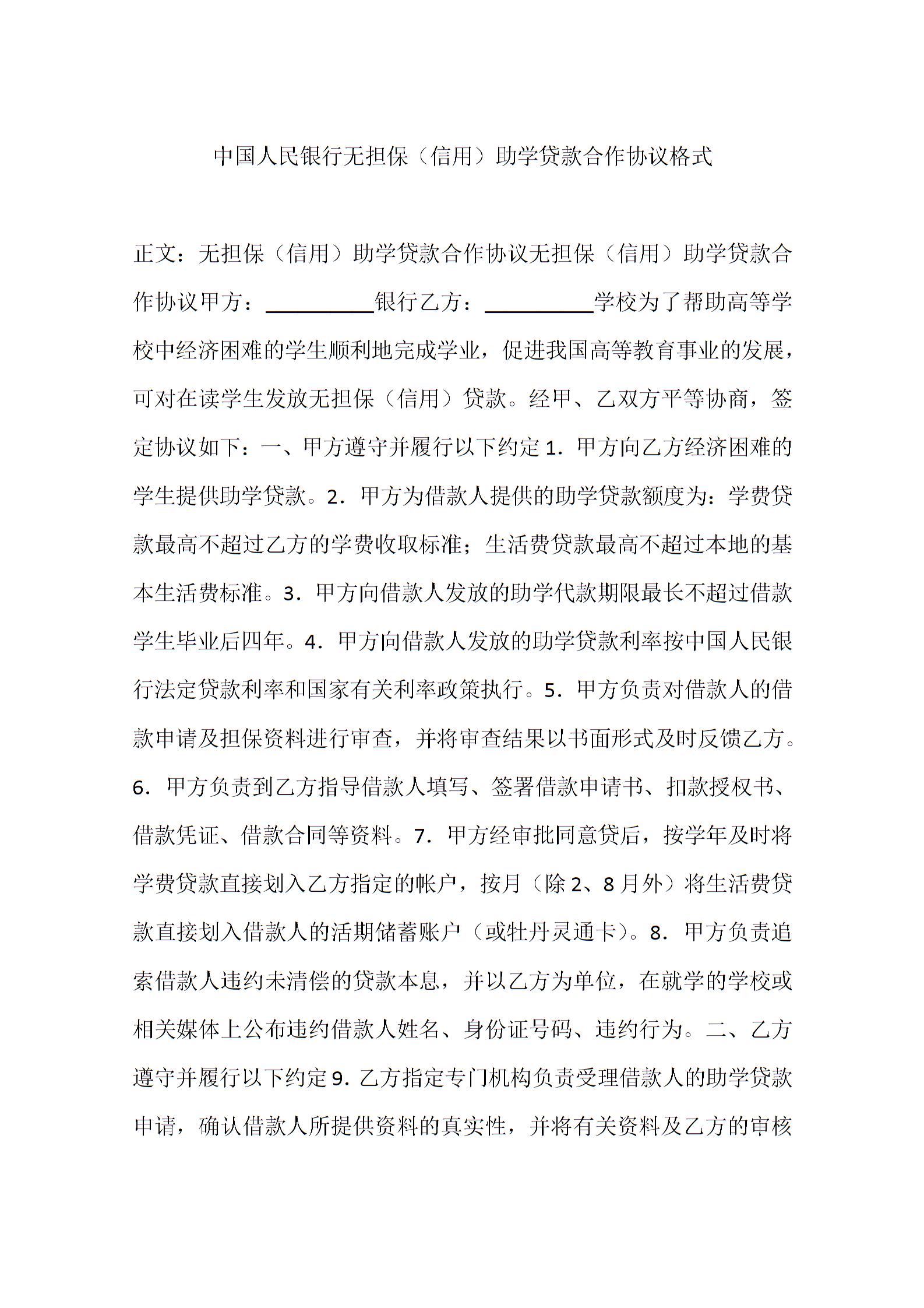 中国人民银行无担保(信用)助学贷款合作协议格式