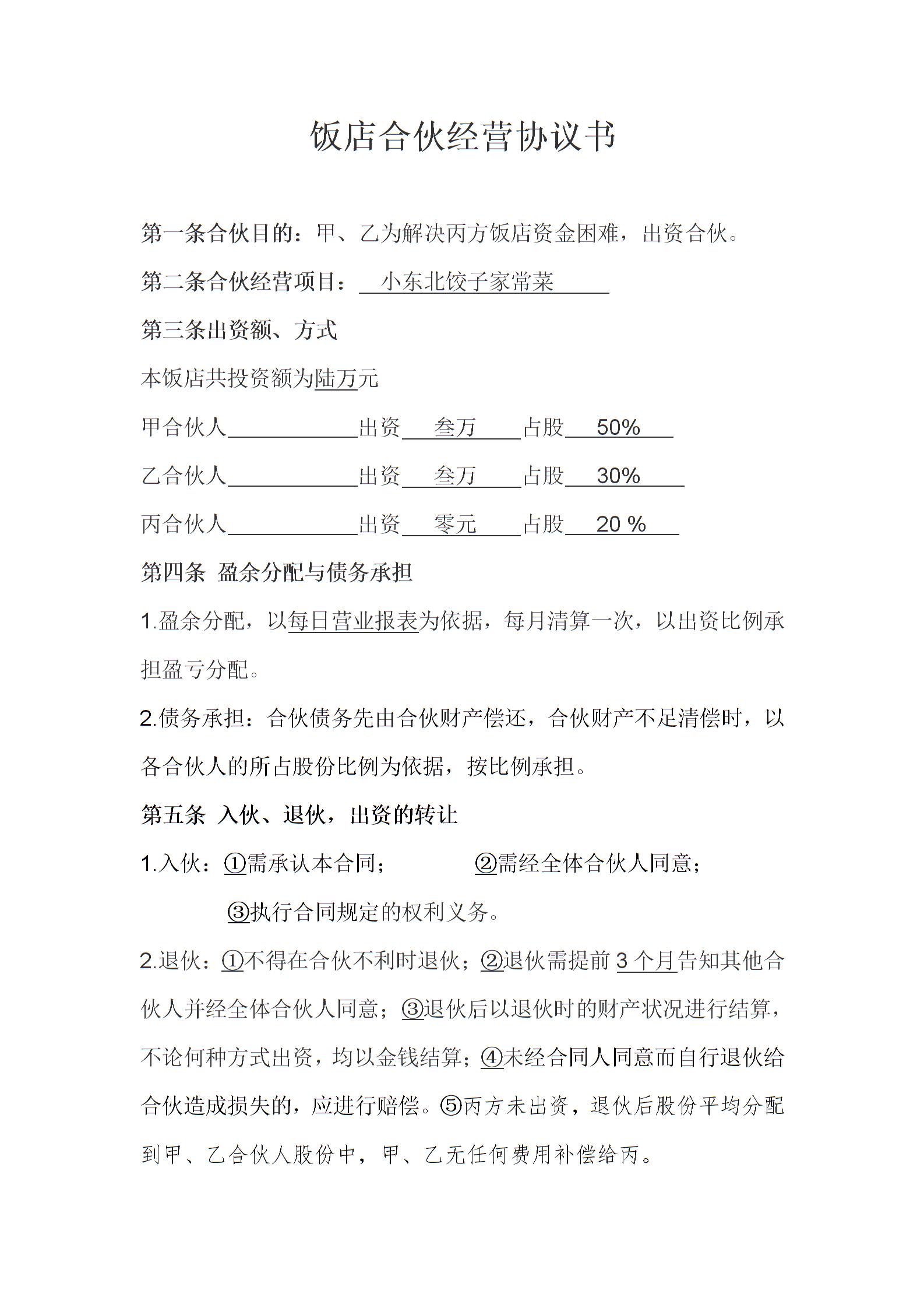 饭店合伙经营协议书