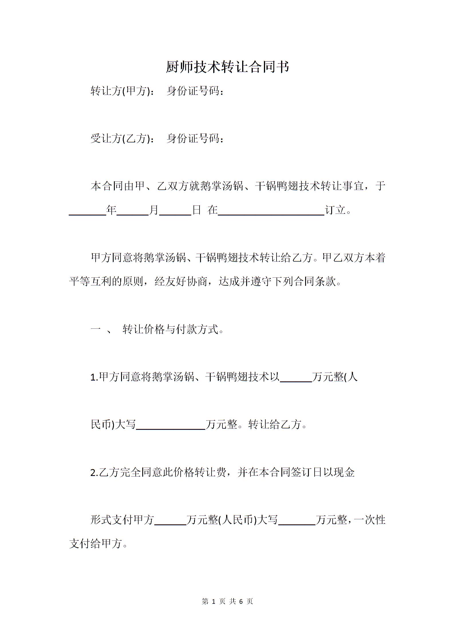 厨师技术转让合同书