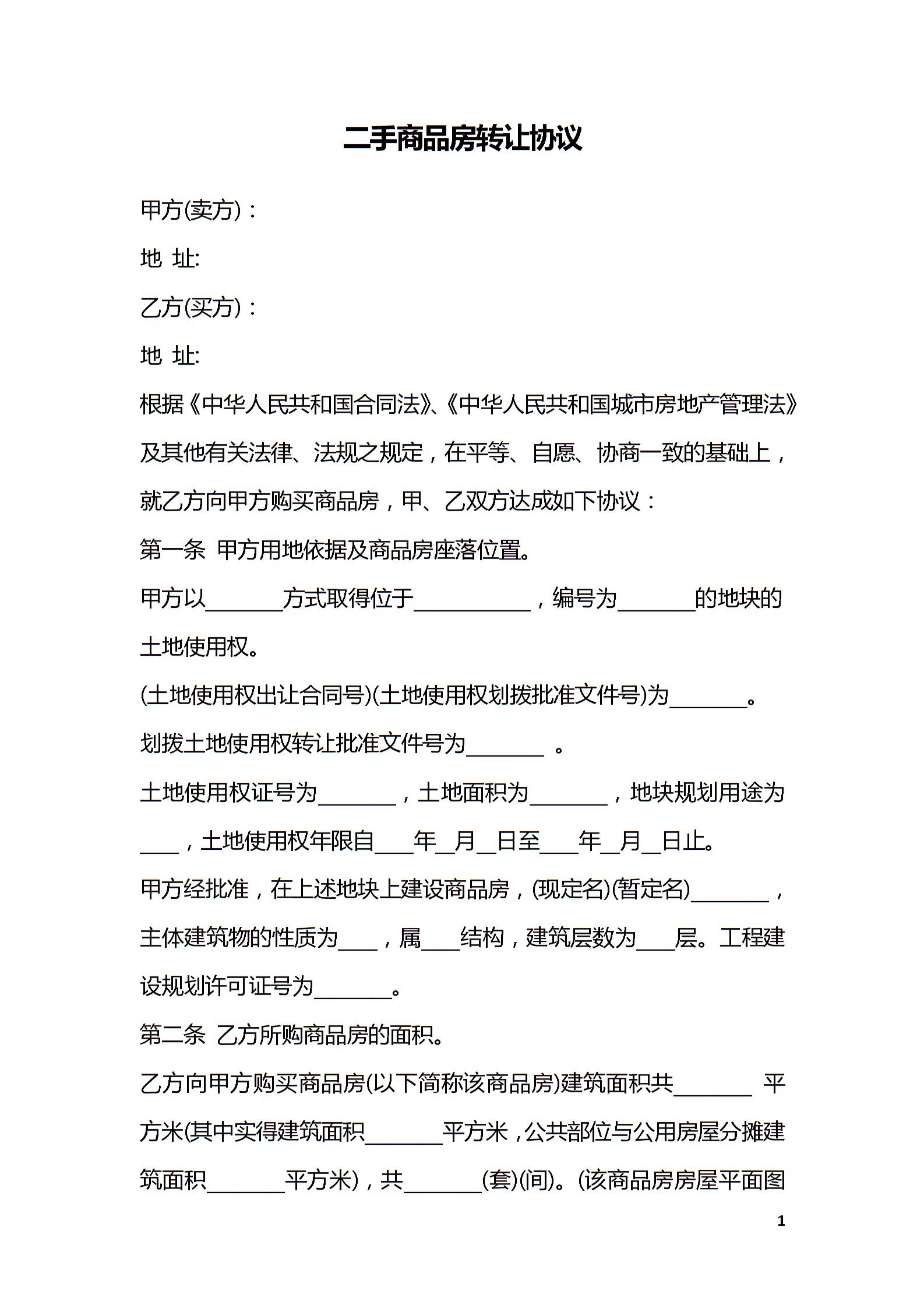 二手商品房转让协议