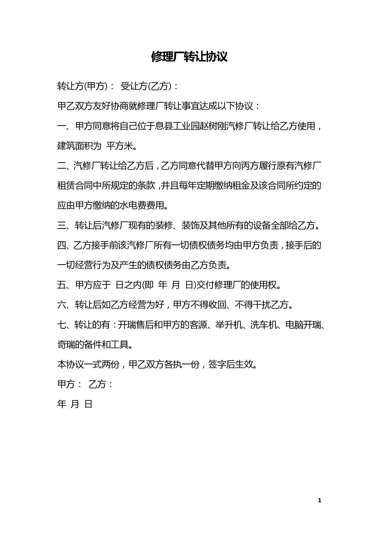 修理厂转让协议