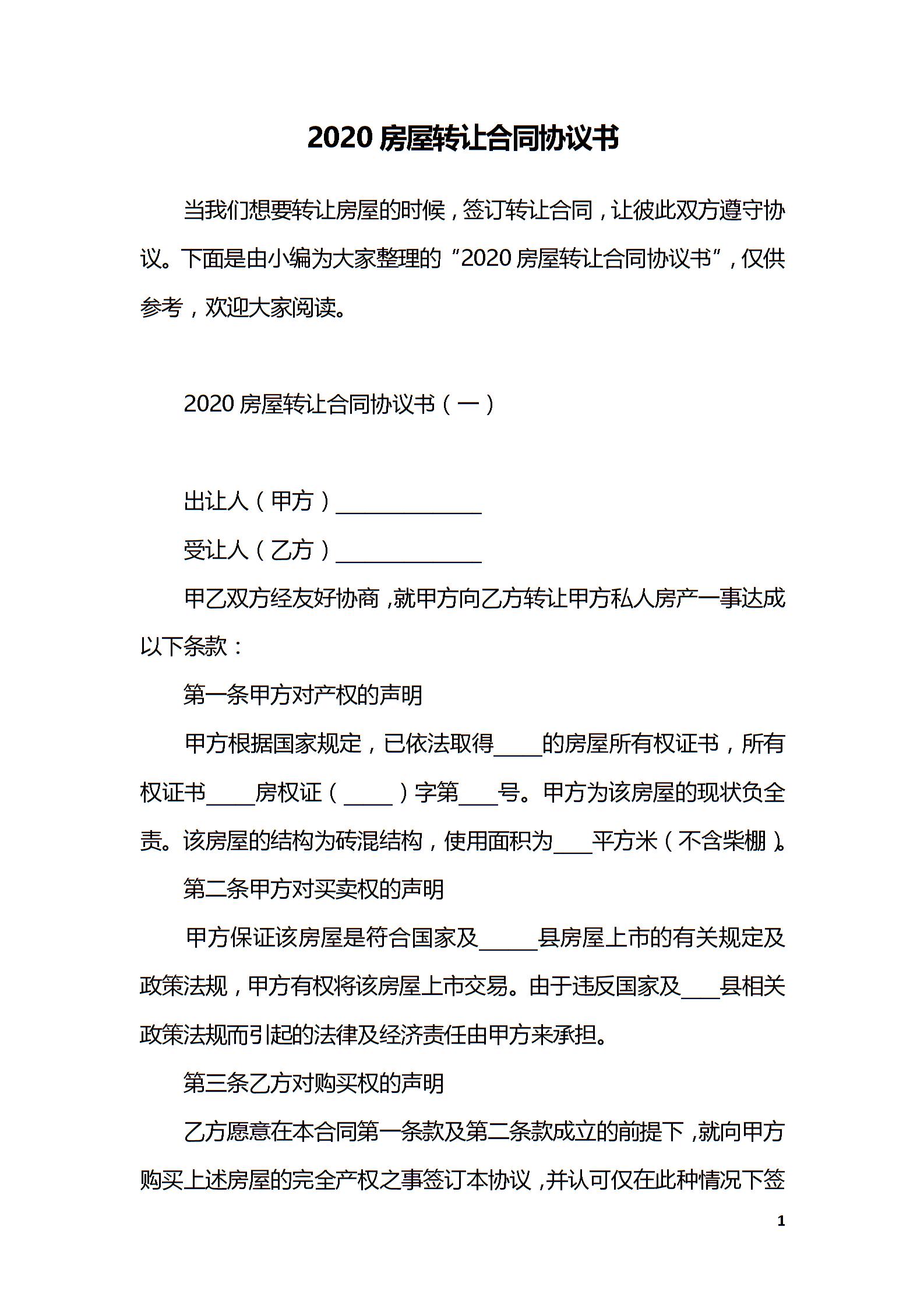 2020房屋转让合同协议书