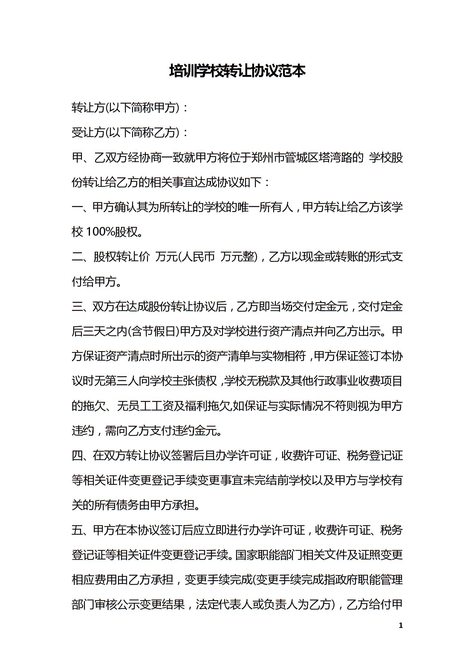 培训学校转让协议范本