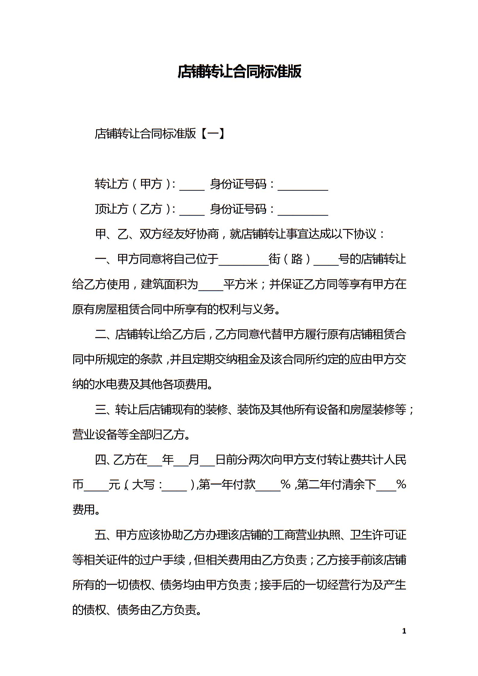 店铺转让合同标准版