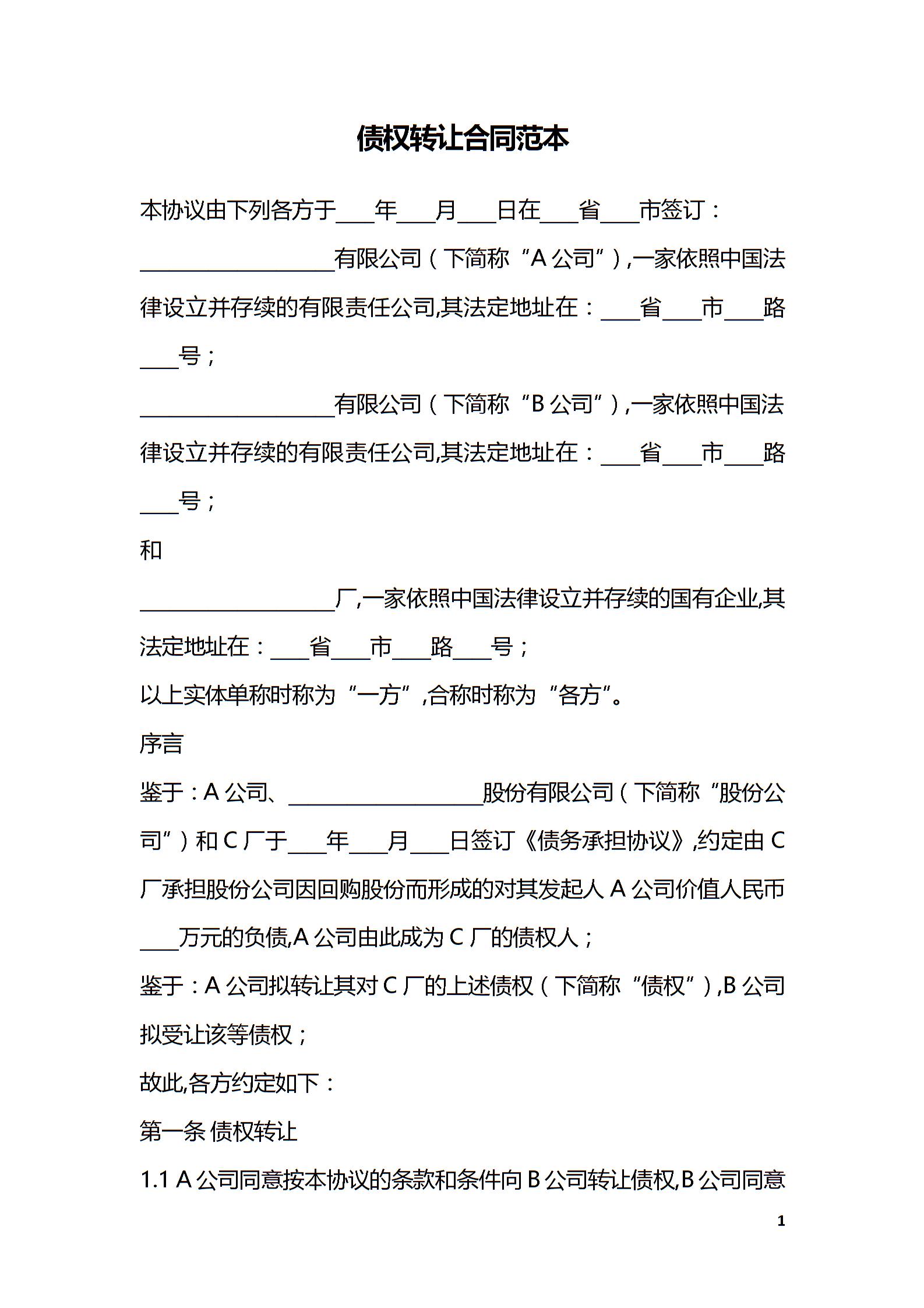 债权转让合同范本