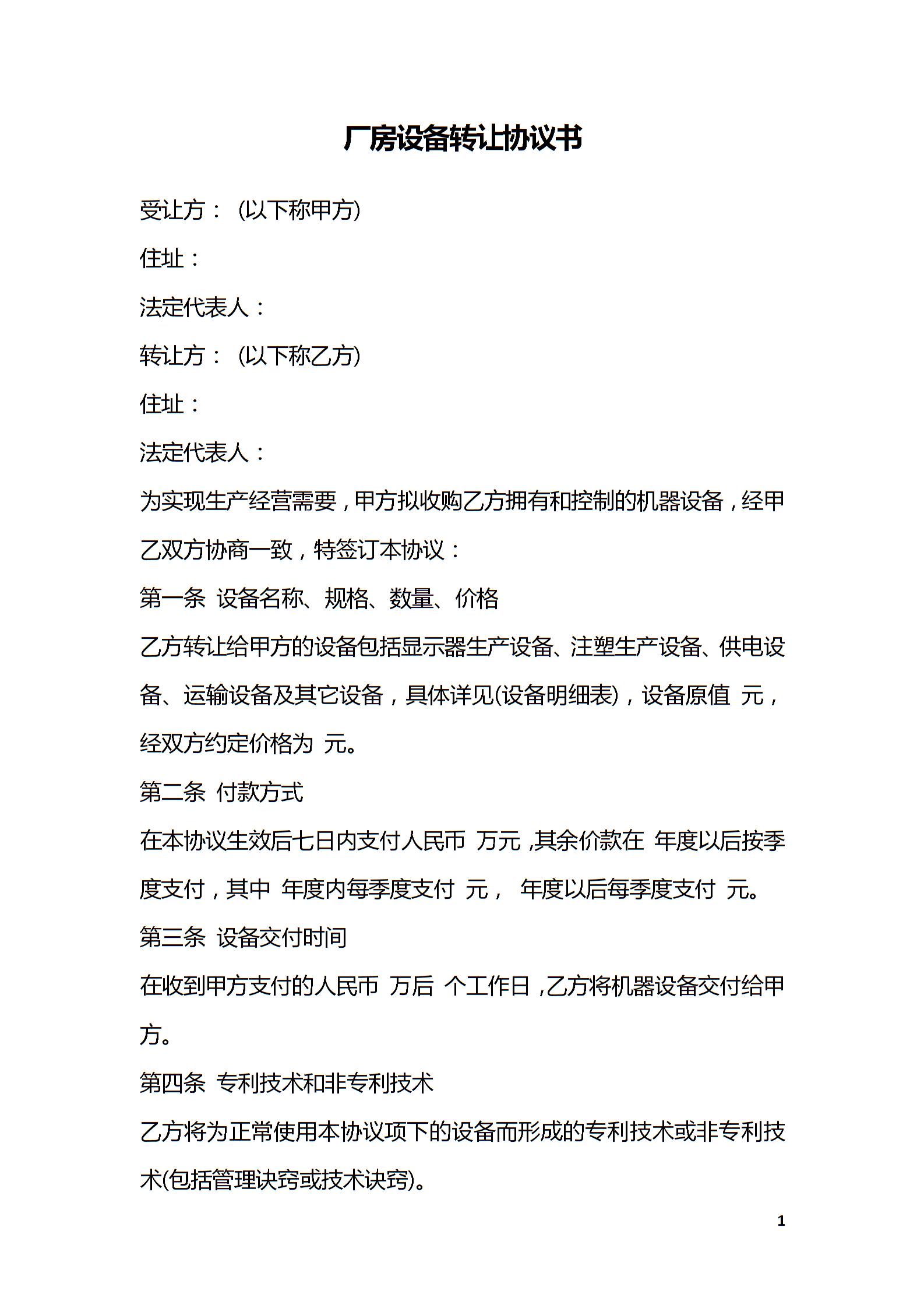 厂房设备转让协议书