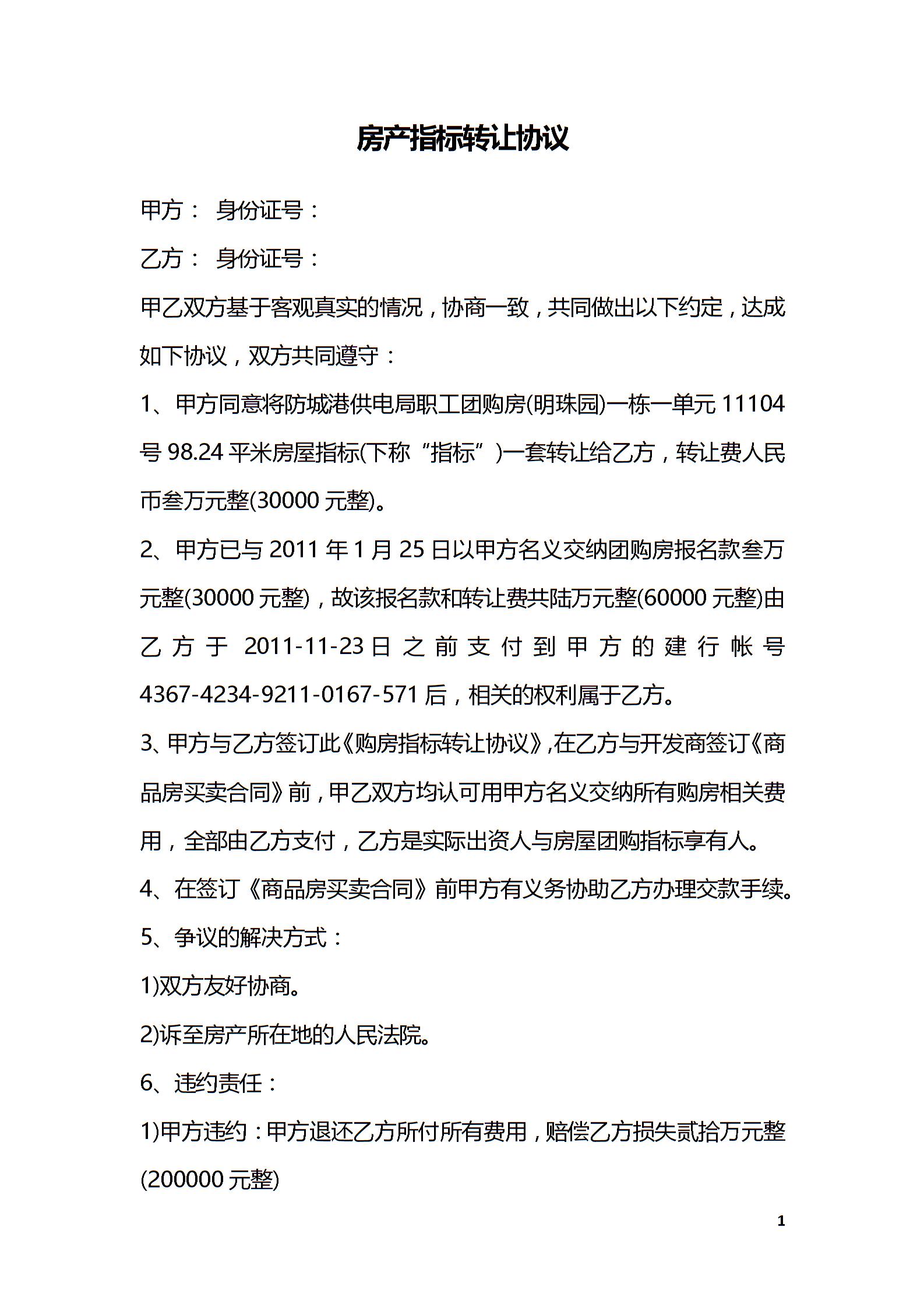 房产指标转让协议