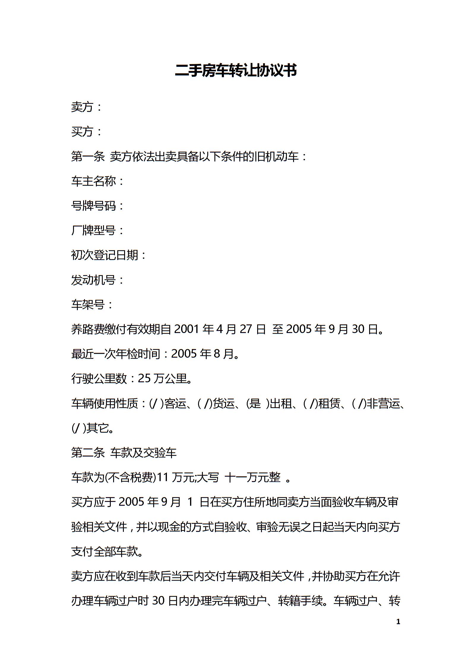 二手房车转让协议书