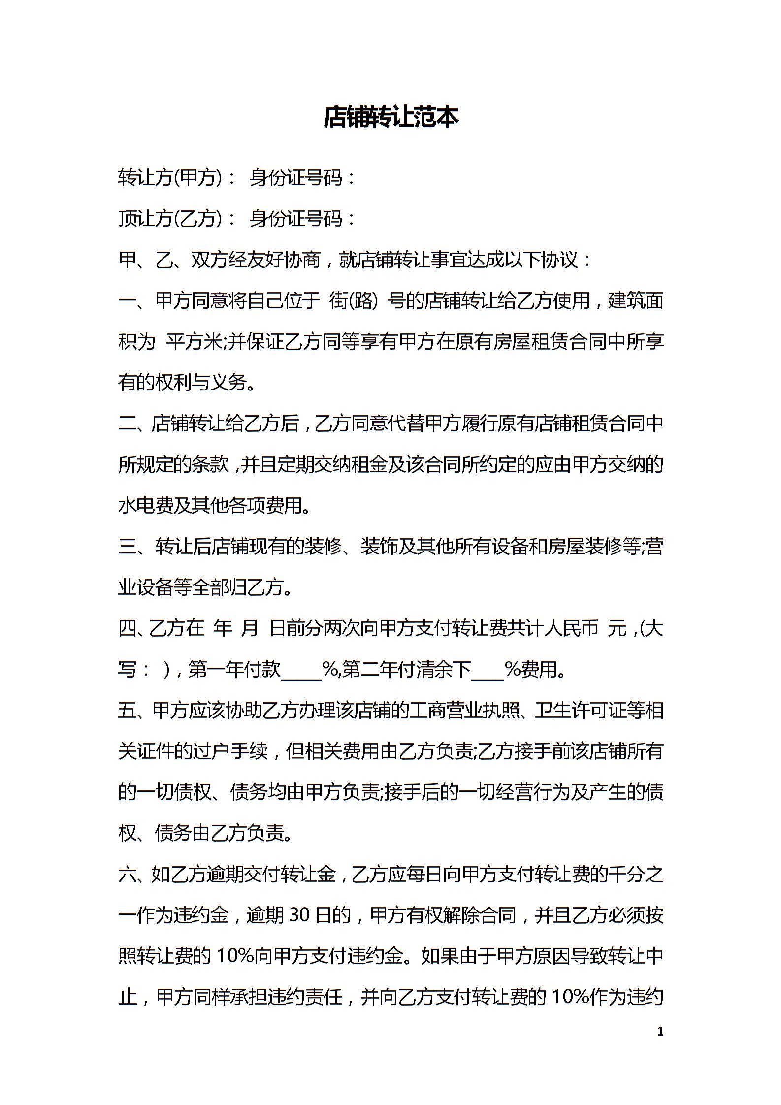 店铺转让范本