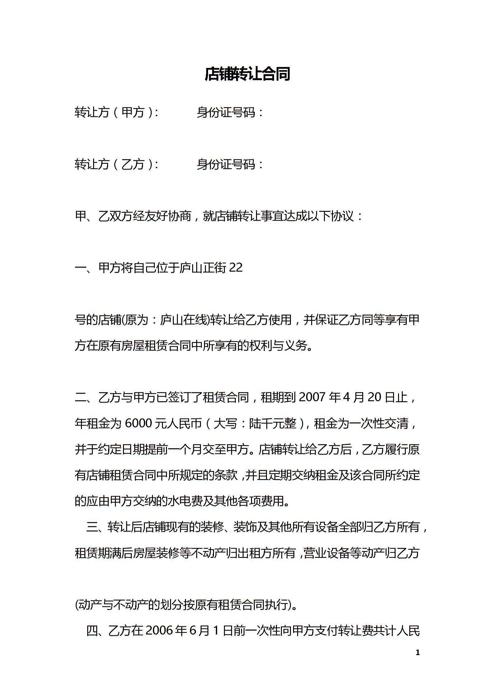 店铺转让合同