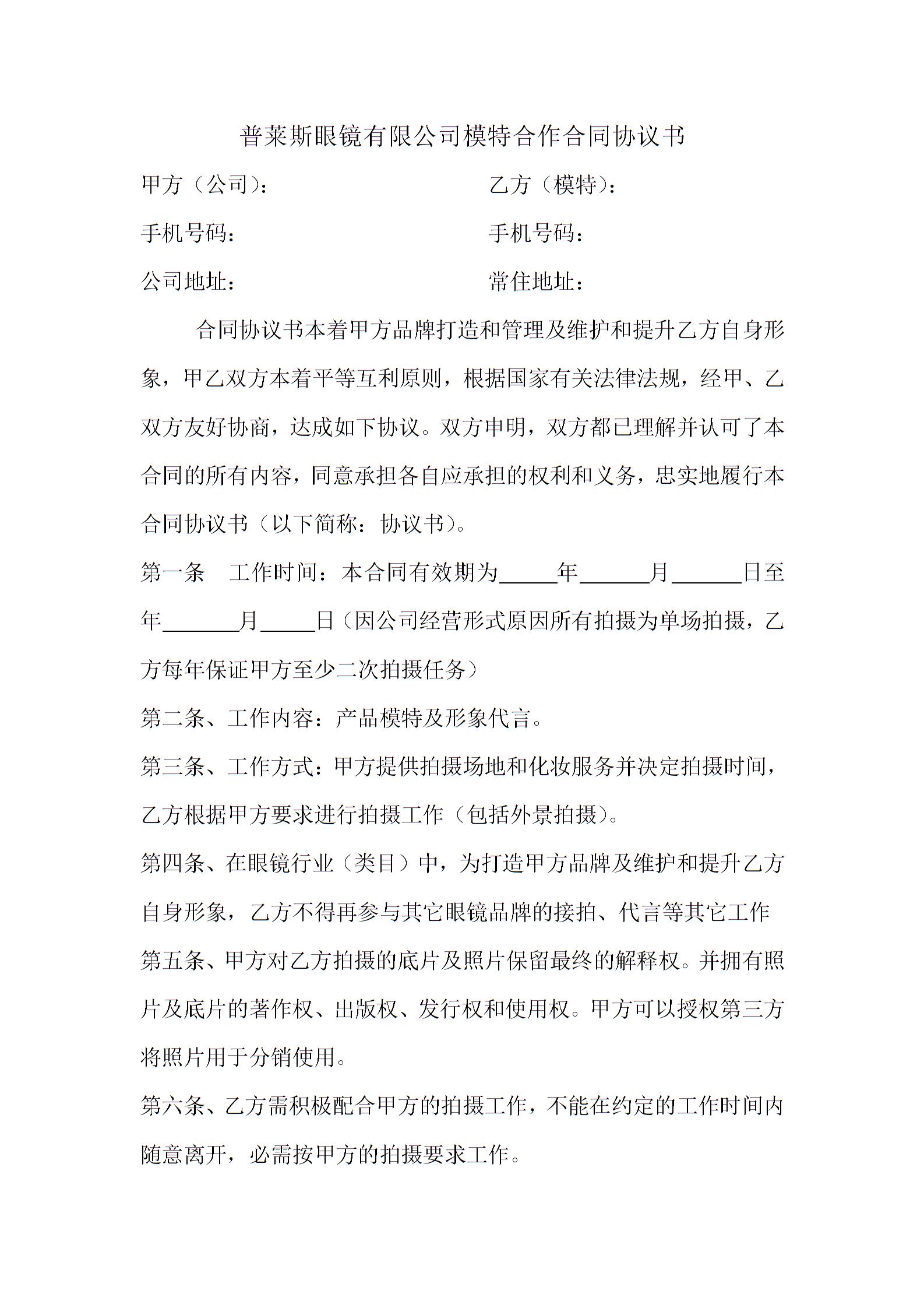 模特合作协议书