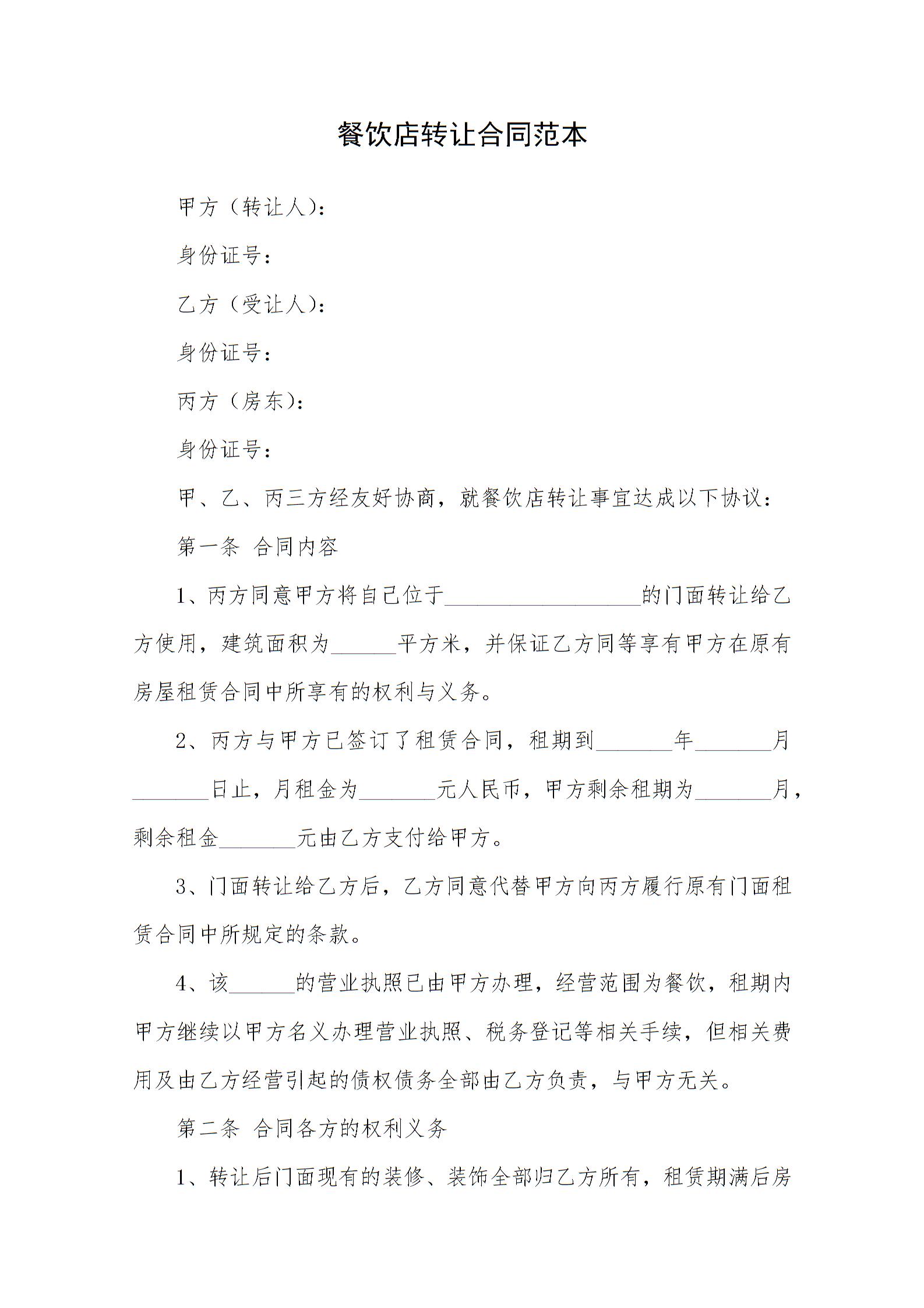 餐饮店转让合同范本