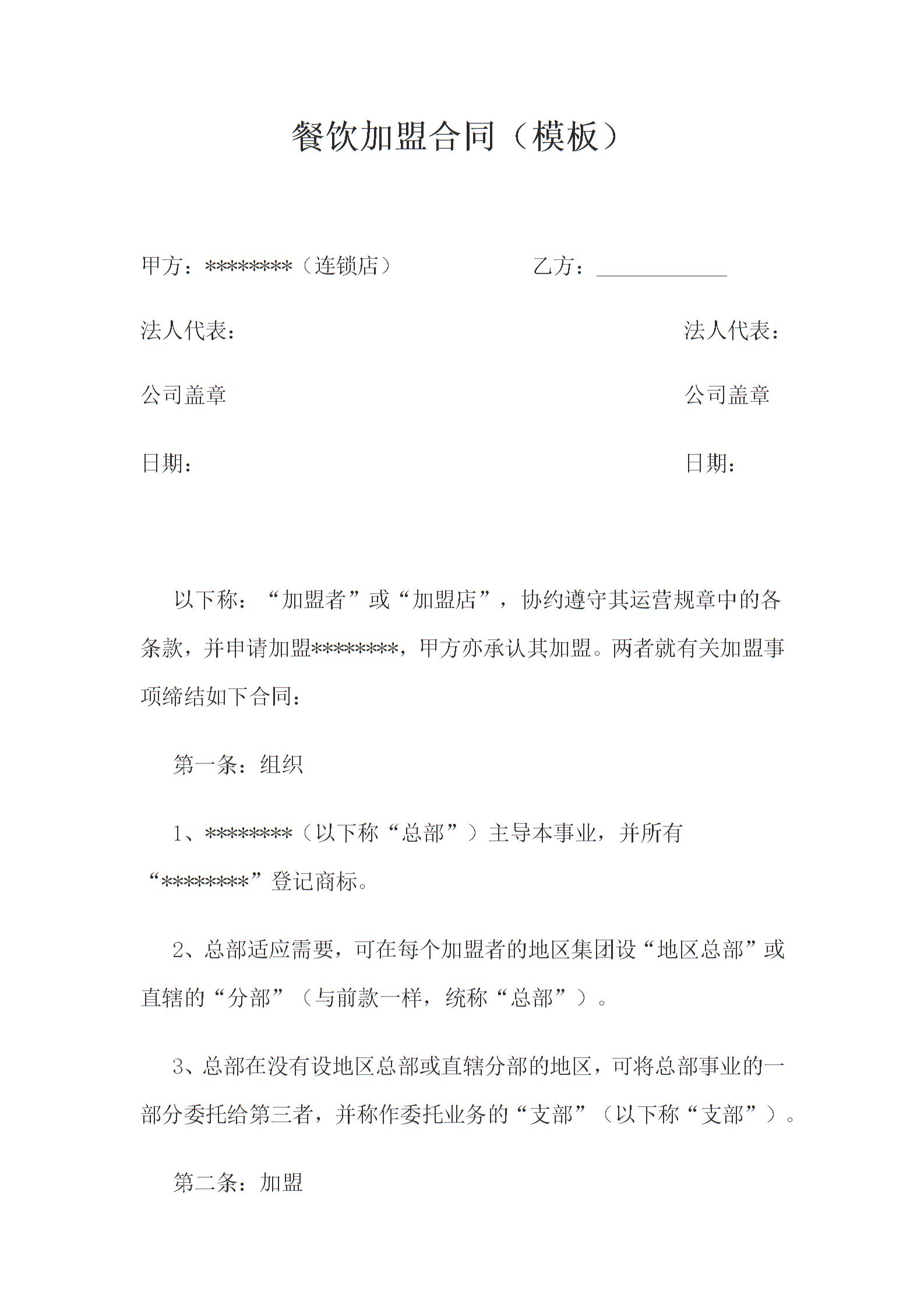 餐饮加盟合同(模板)