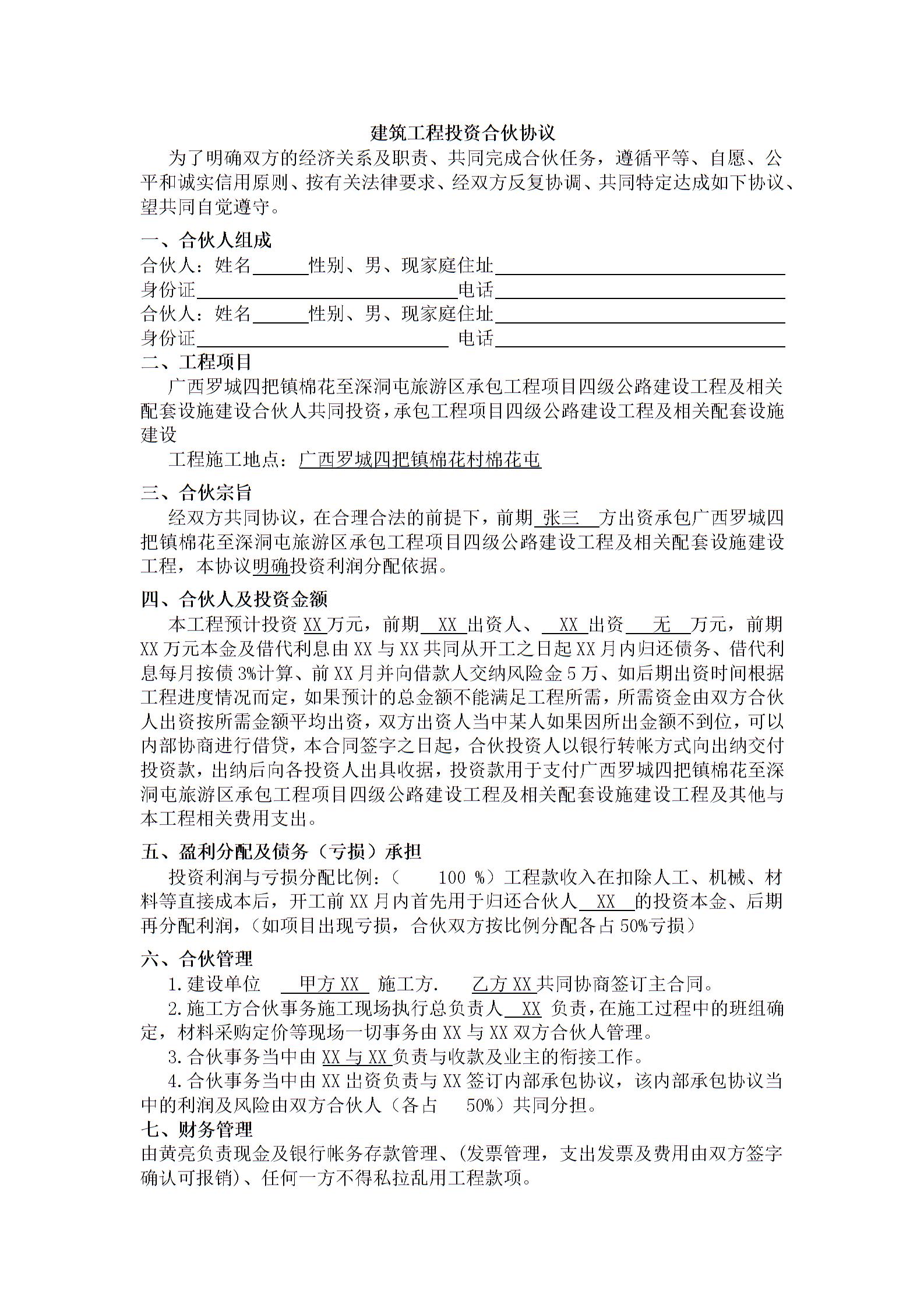 建筑工程投资合伙协议