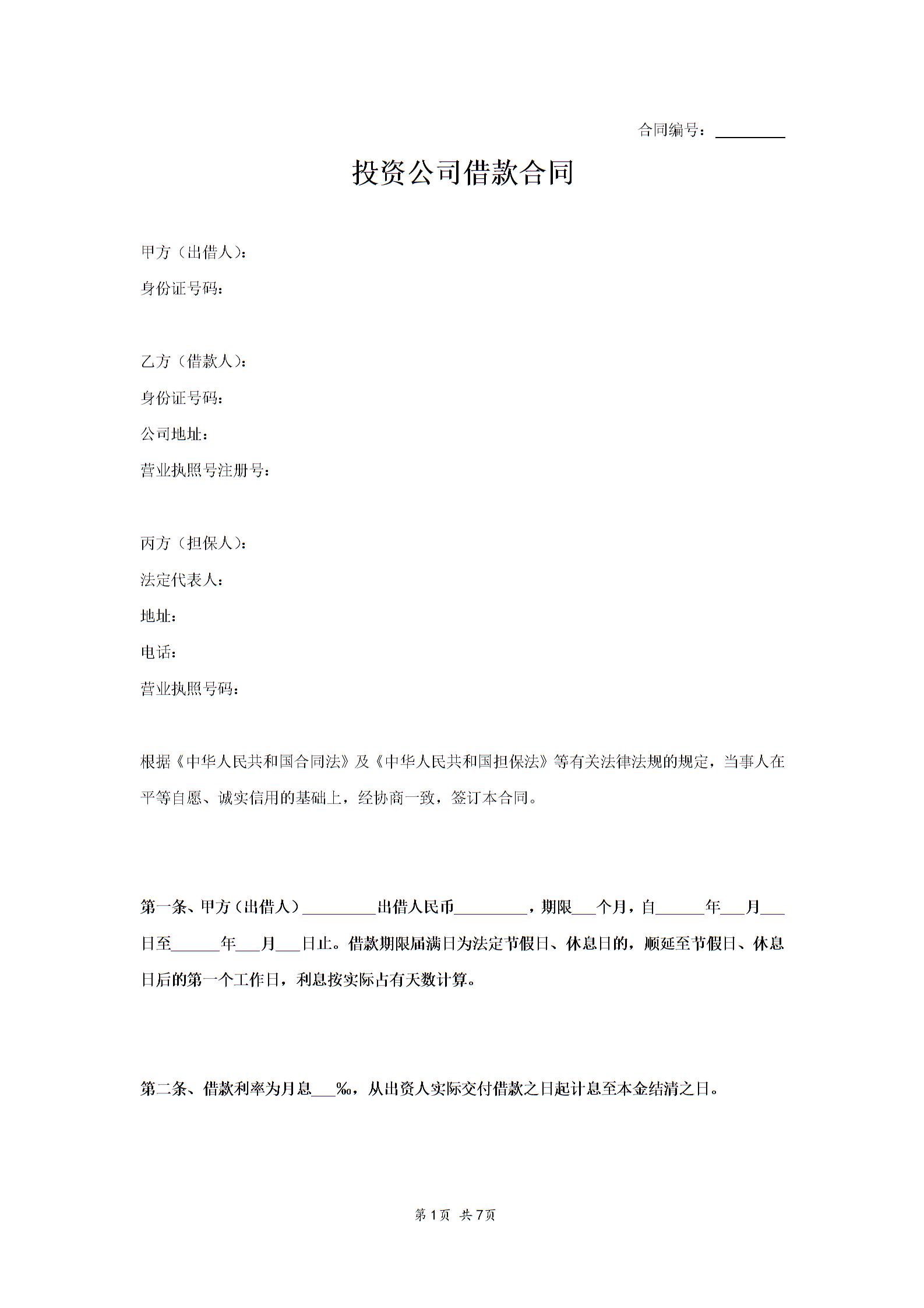 投资公司借款合同范本模板