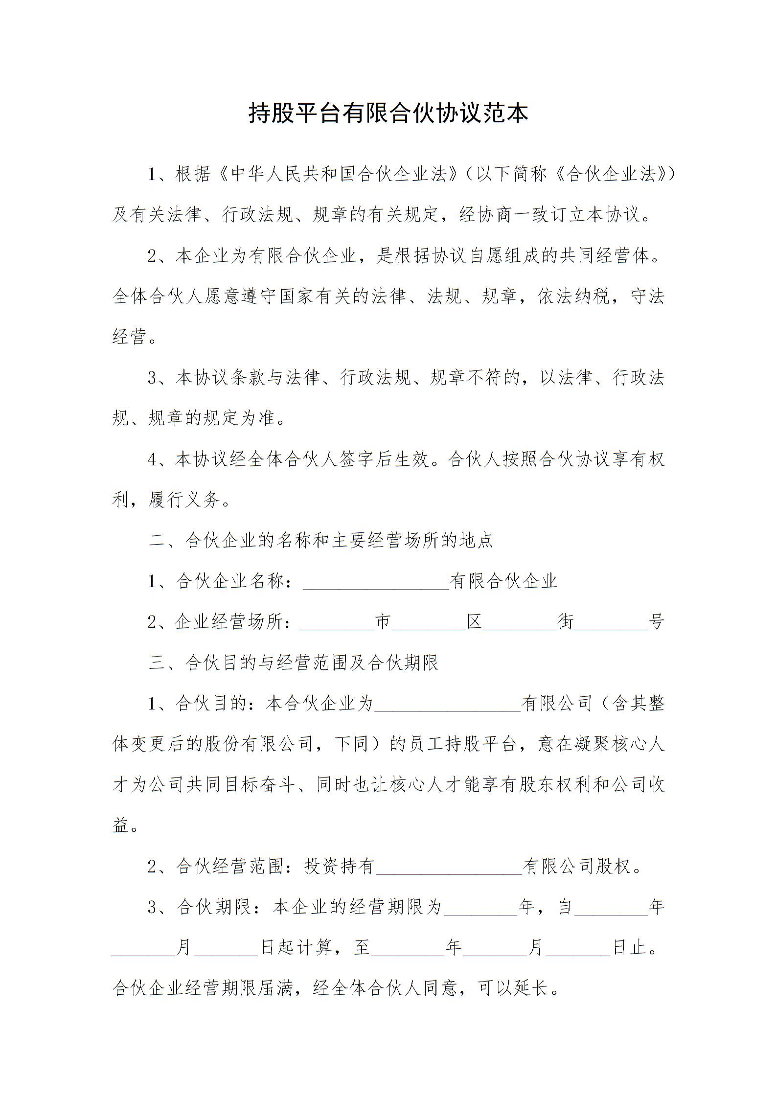 持股平台有限合伙协议范本