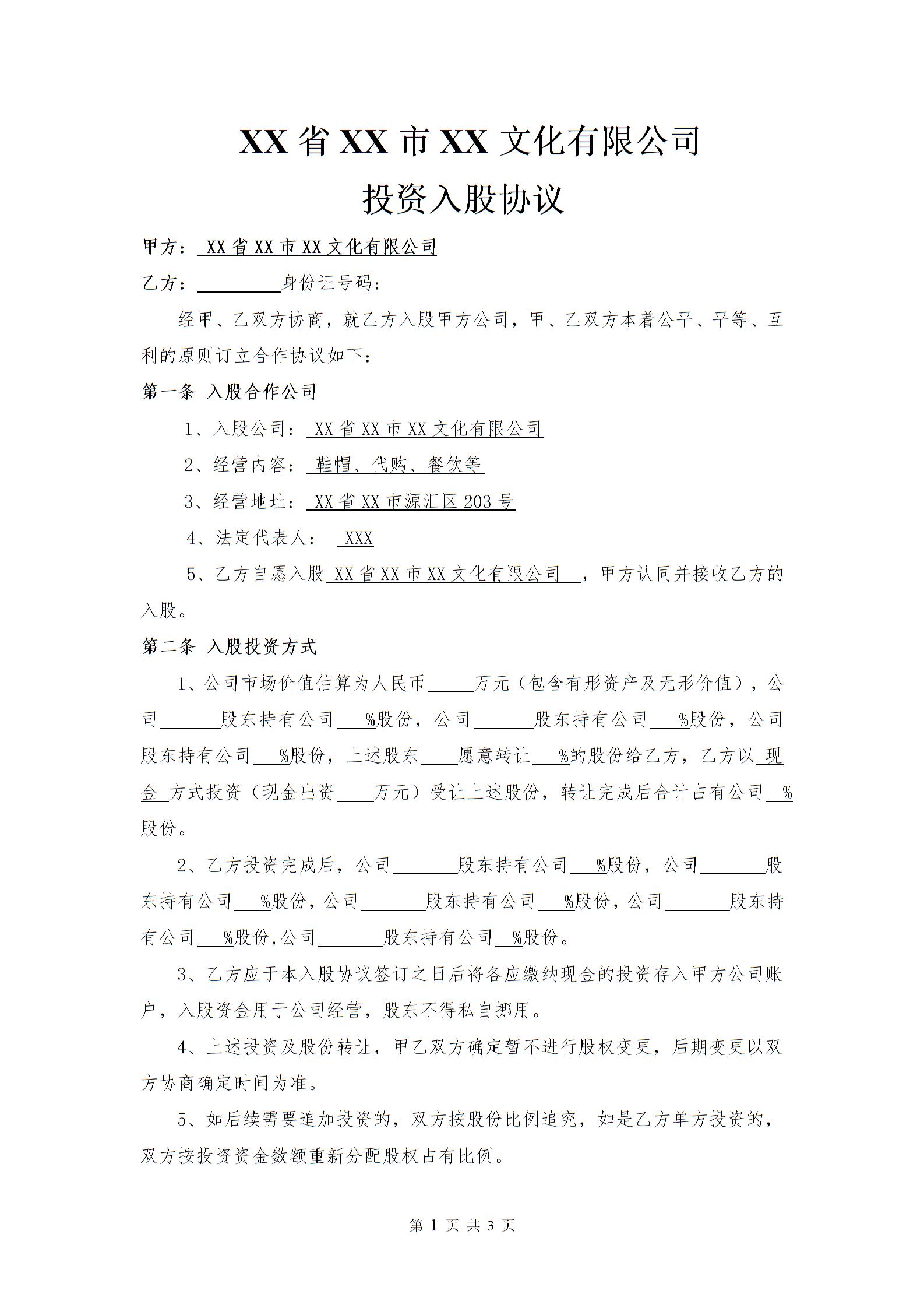 投资入股协议(公司)律师拟定版本