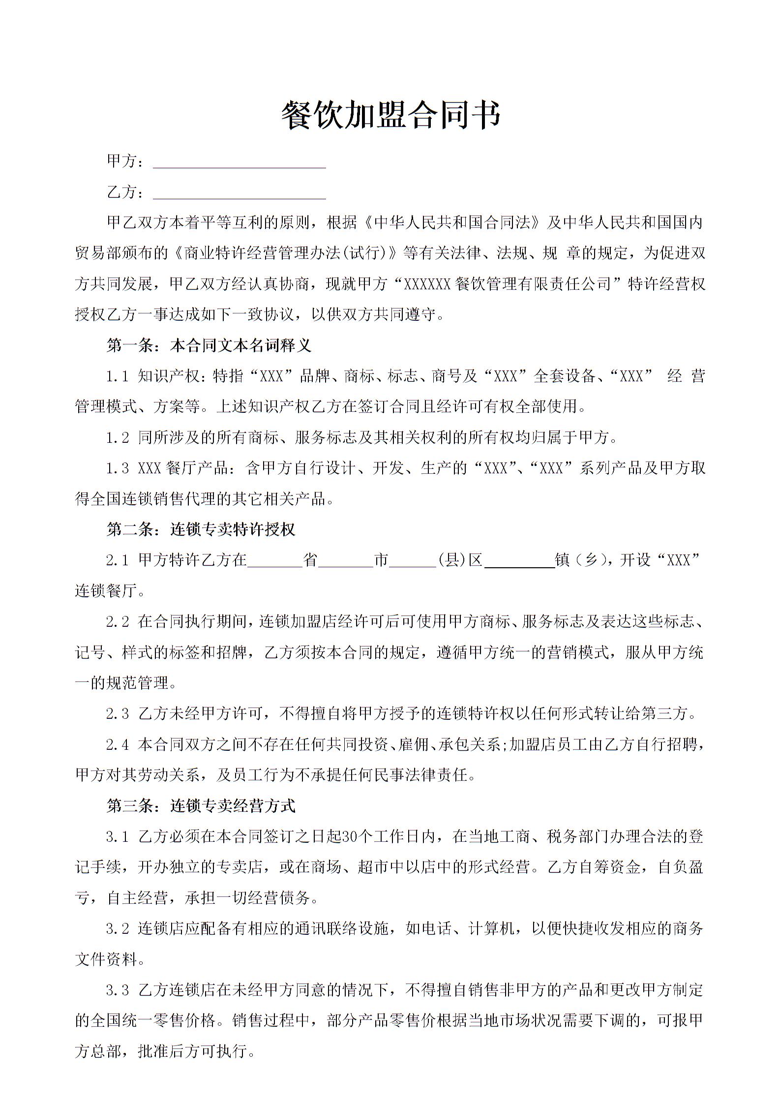 餐饮加盟合同书