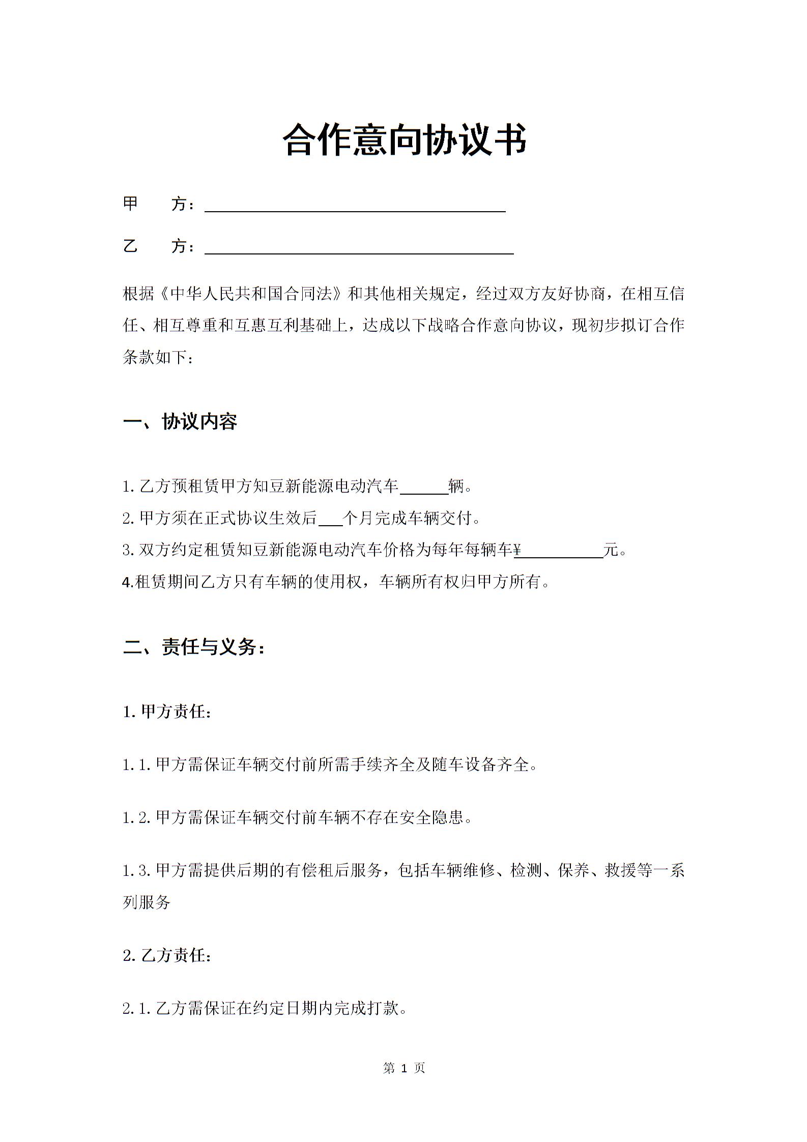 合作意向协议书--范本