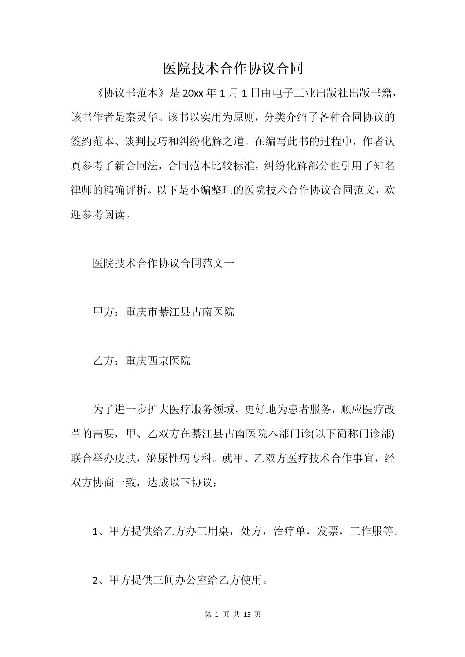 医院技术合作协议合同