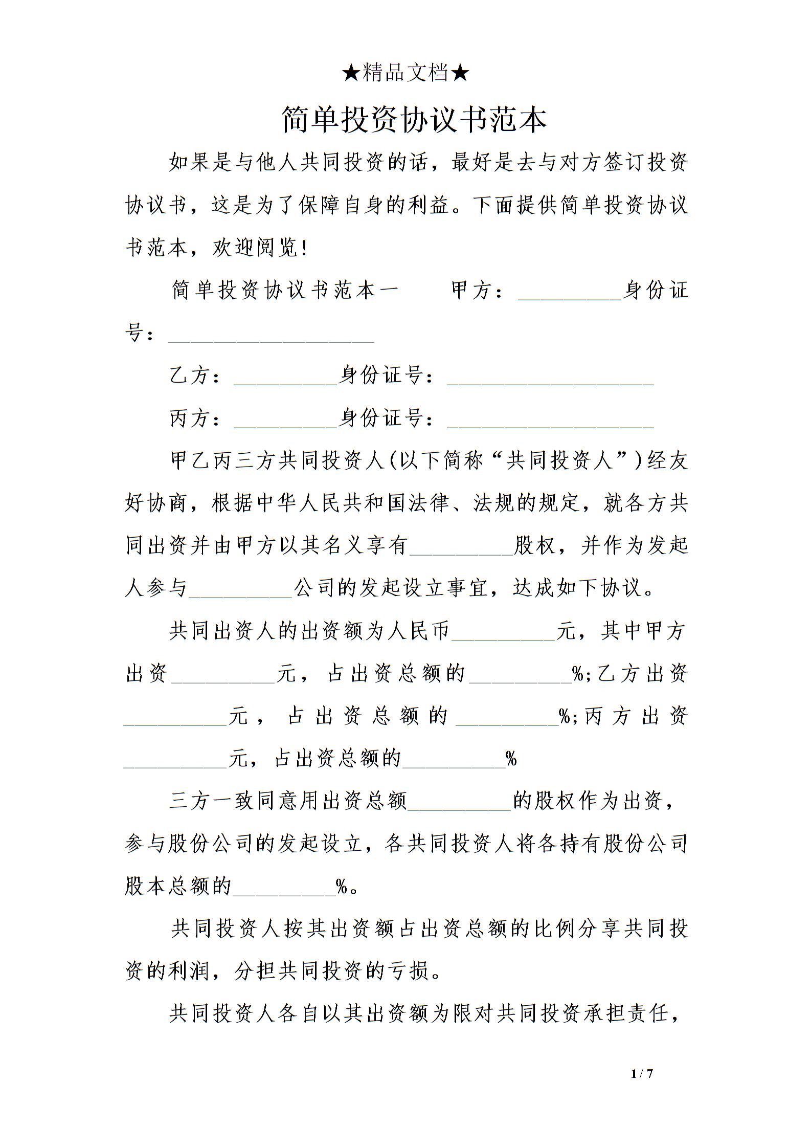 简单投资协议书范本