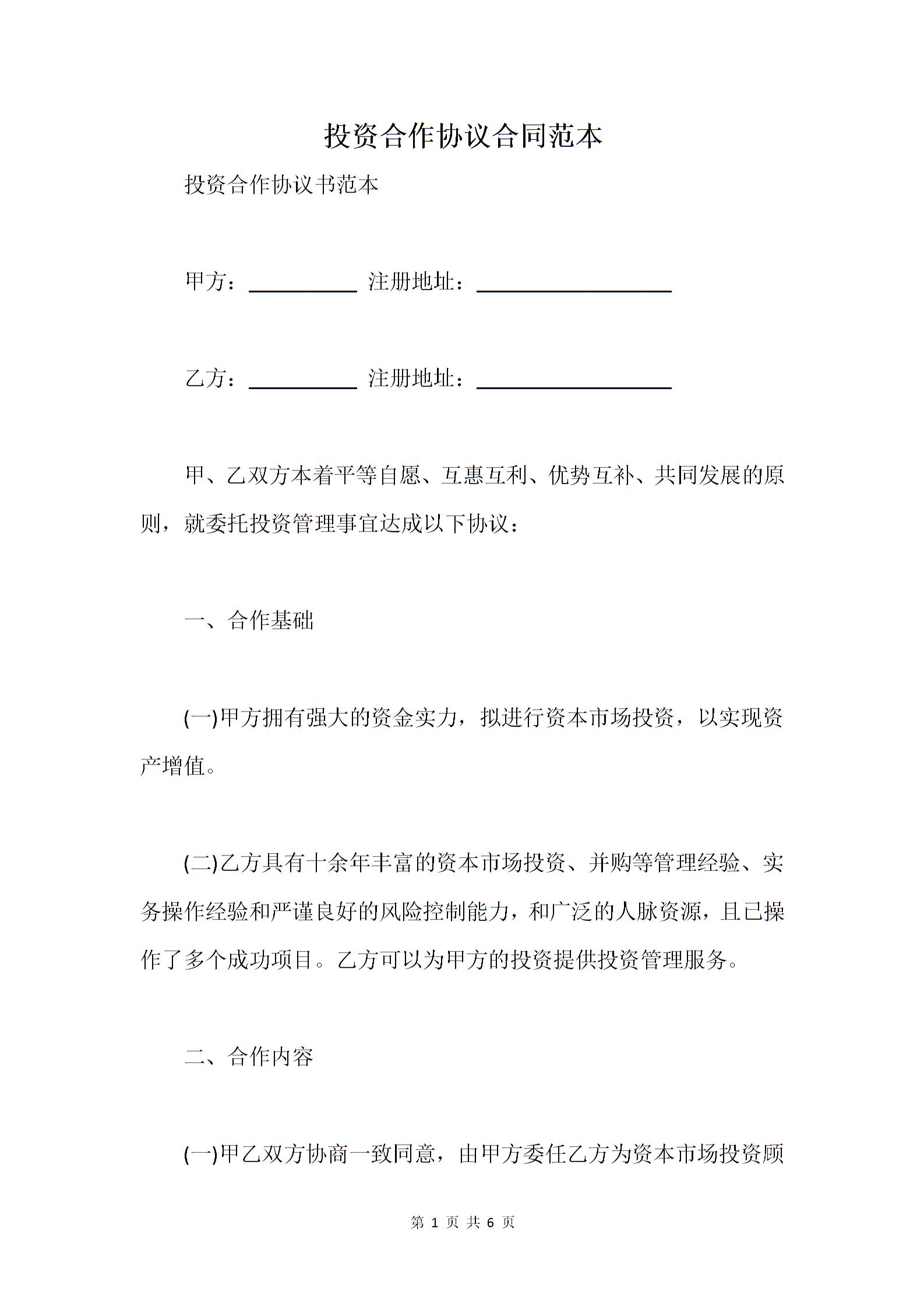 投资合作协议合同范本