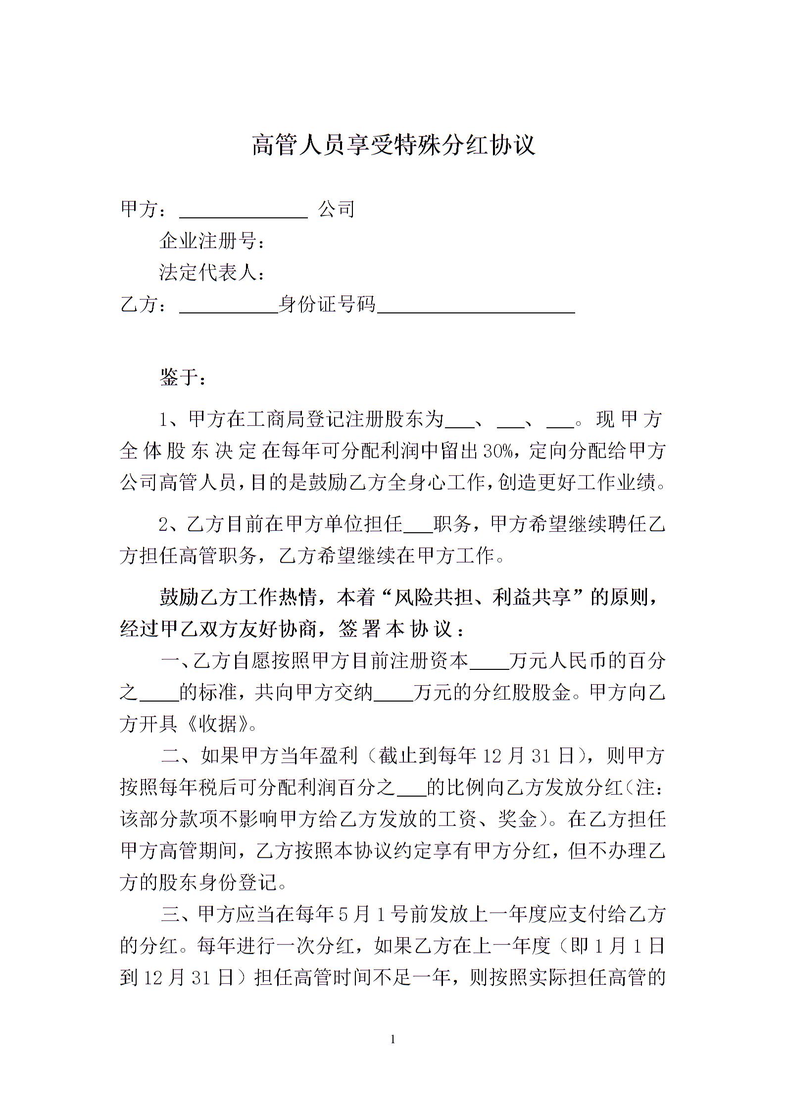 有限公司高管享受分红协议