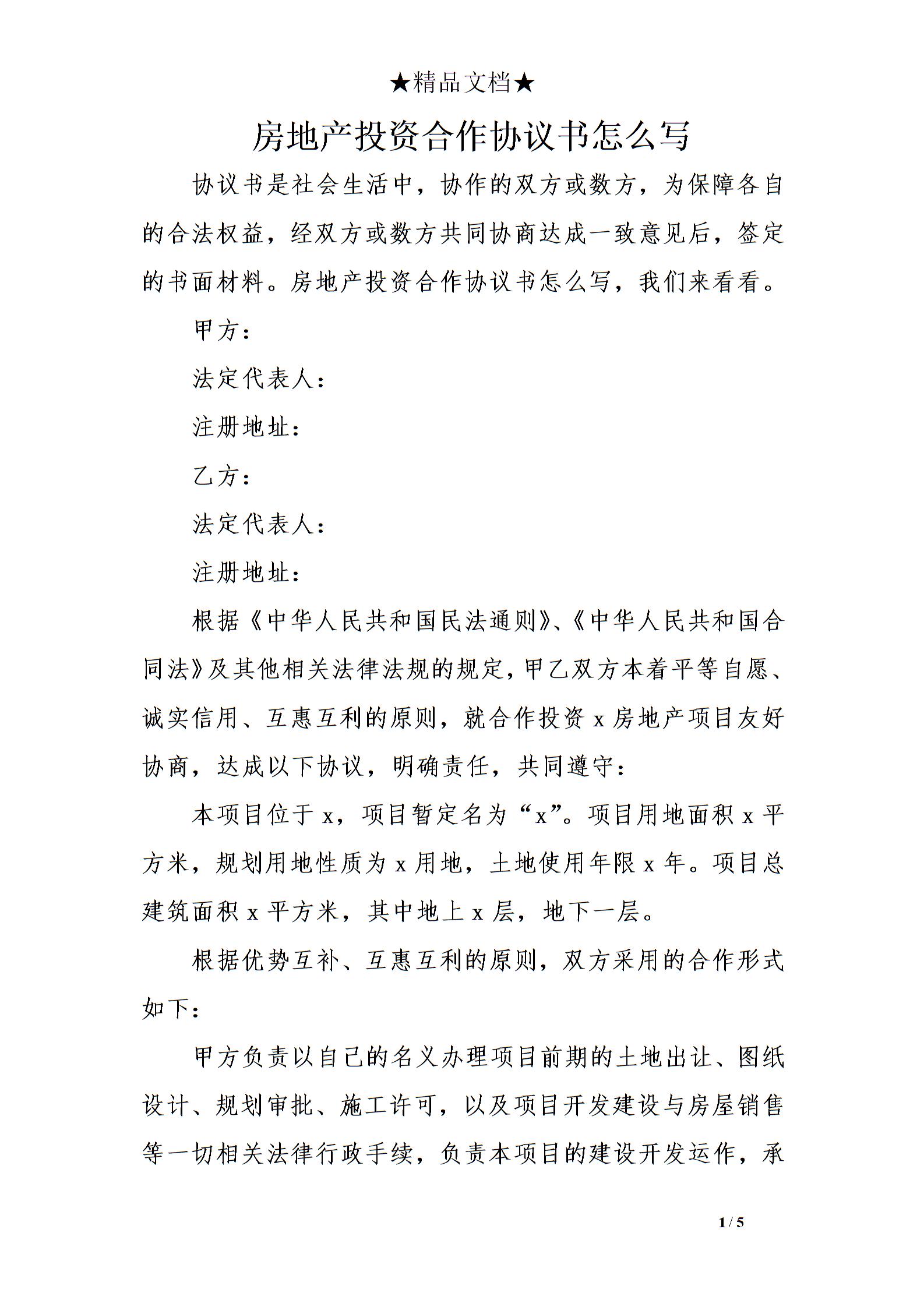 房地产投资合作协议书