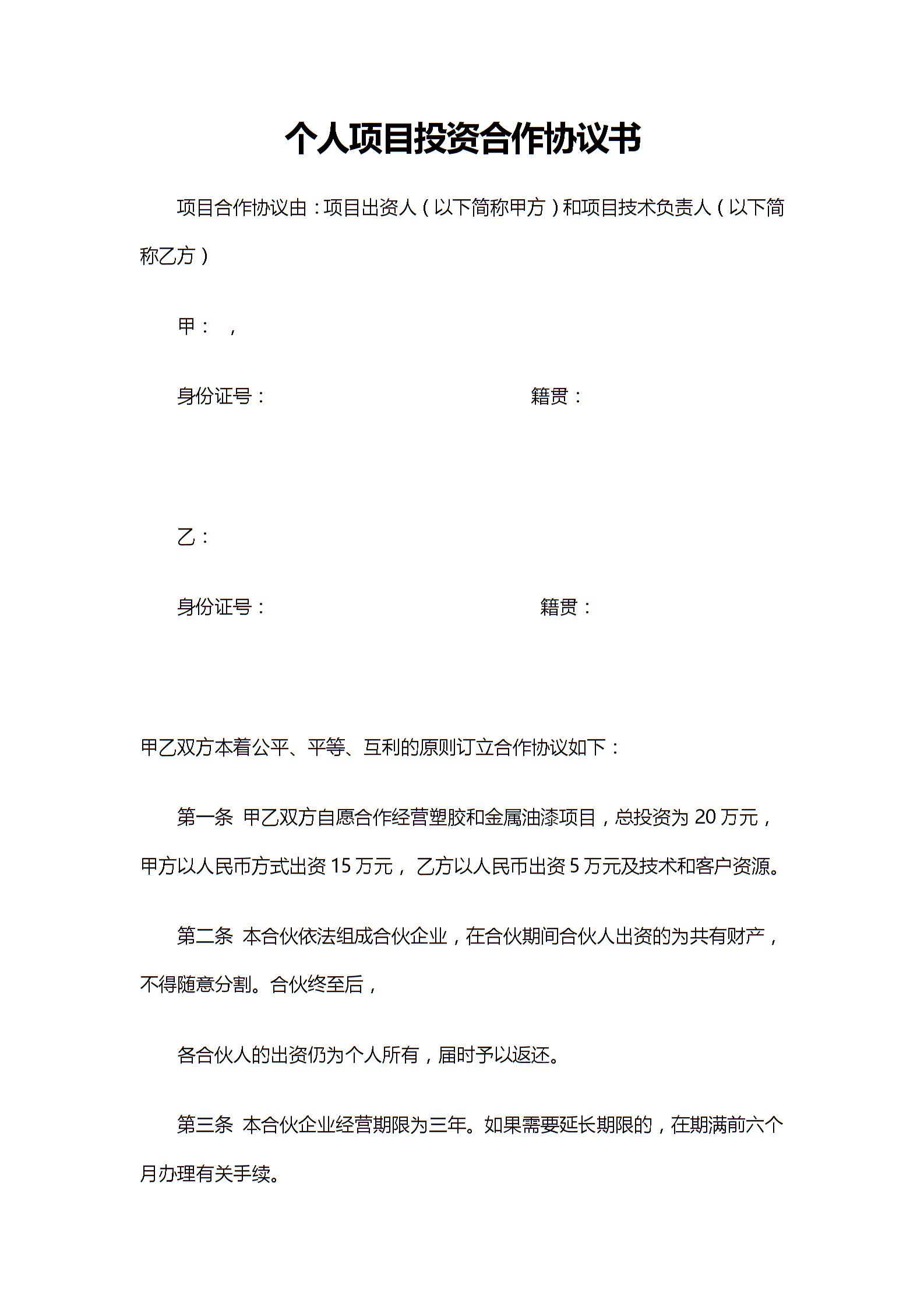 个人项目投资合作协议书