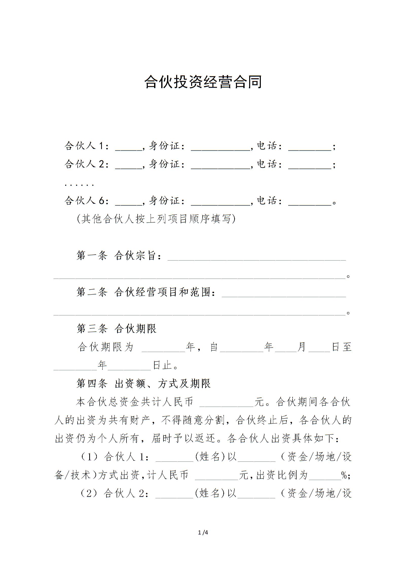 多人合伙投资经营合同-标准商业合同